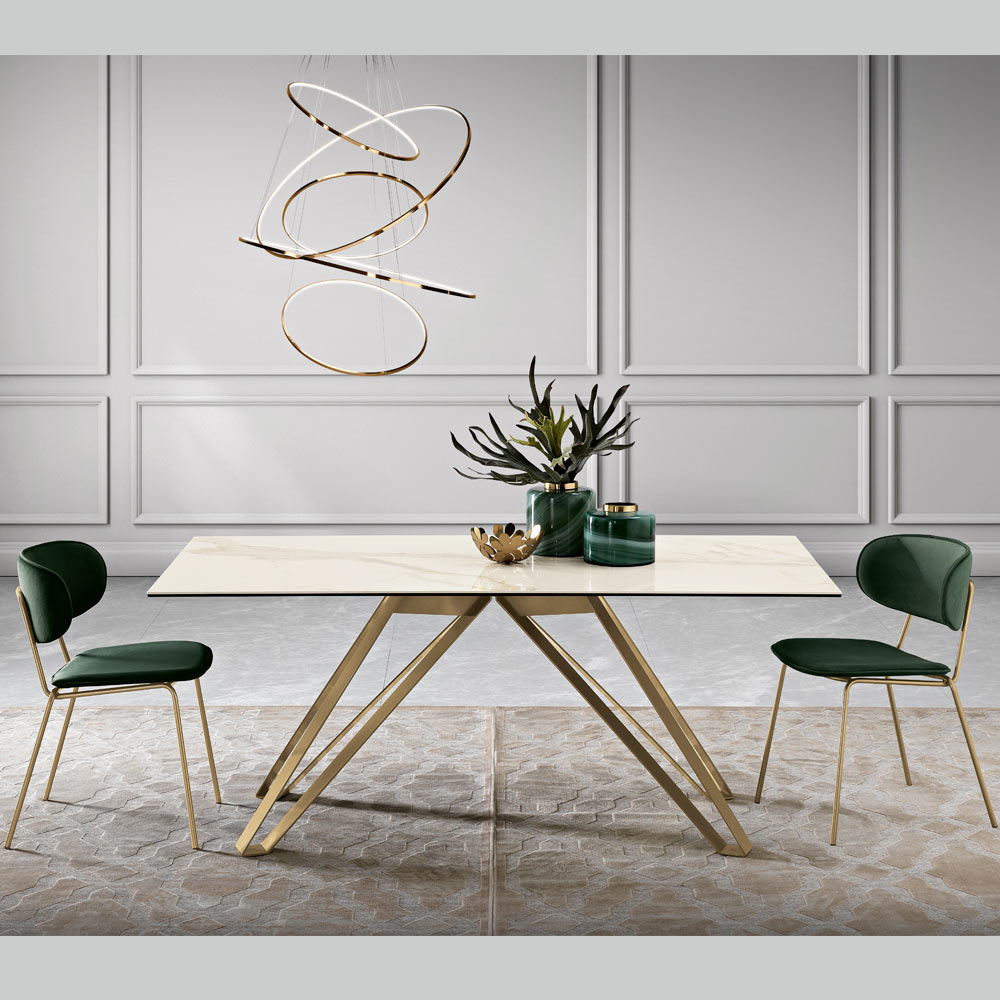 Dieser Tisch besticht durch seinen Material- und Farbkontrast und ist ein wahrer Ausdruck von Luxus und modernem Design. Die Glaskeramikplatte mit Calacatta-Marmoreffekt und zarten Farbtönen ist ein Ausdruck natürlicher Eleganz, widerstandsfähig und gleichzeitig äußerst raffiniert.