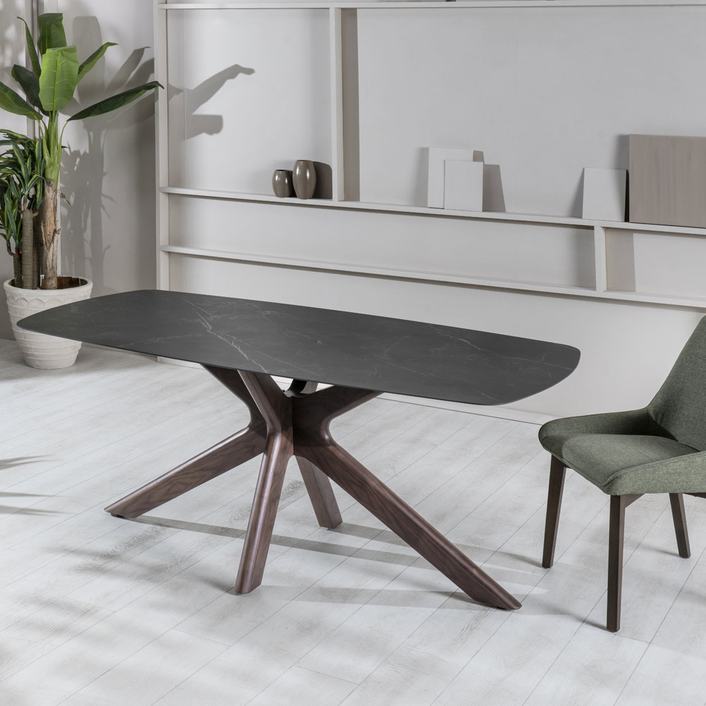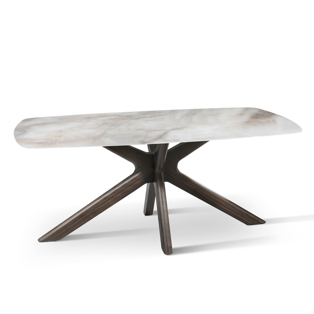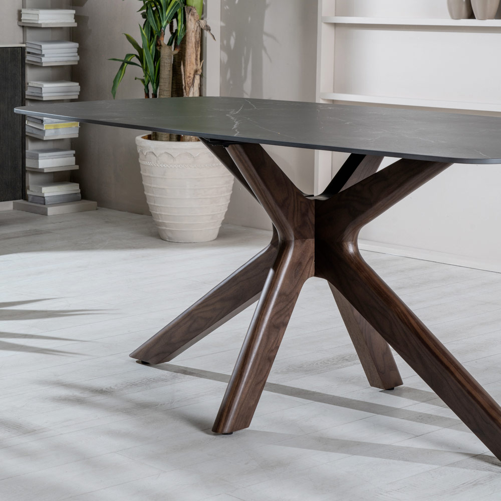 Es handelt sich um einen raffinierten und originellen Tisch, bei dem fließende und weiche Linien miteinander spielen und Details von großer visueller Stärke schaffen. Die Keramikplatte ruht sanft auf dem sternförmigen Sockel aus massivem Walnussholz. Als Ergebnis einer Forschung, die die unterschiedlichsten Stile und Inspirationen erforscht, ist es ein echter Protagonist des Wohnbereichs und fügt sich harmonisch sowohl in Umgebungen mit modernem Design als auch in Räume ein, die Luxus und klassischen Stil bevorzugen.