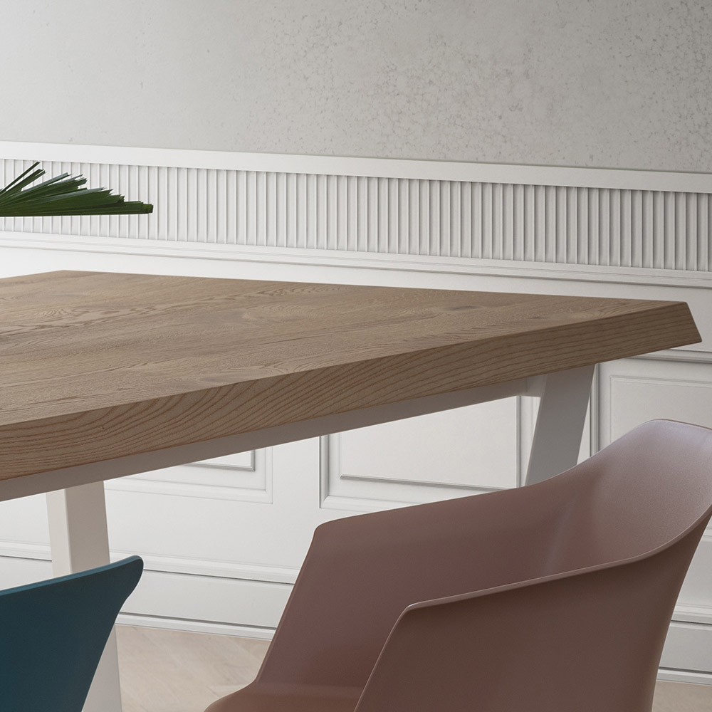 Rechteckiger , feststehender Esstisch, hergestellt in Italien, mit epoxidpulverbeschichteten Metallbeinen in weißer Ausführung und 50 mm starker, entrindeter Holzplatte . Ein Möbelstück, das sich durch eine elegante und skulpturale Struktur auszeichnet, die aus der Kombination von Materialien unterschiedlicher Art und der Leidenschaft für die Verarbeitung entsteht.