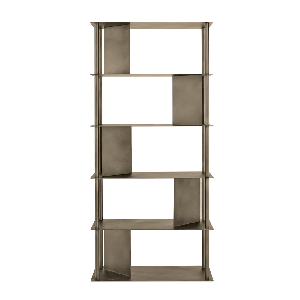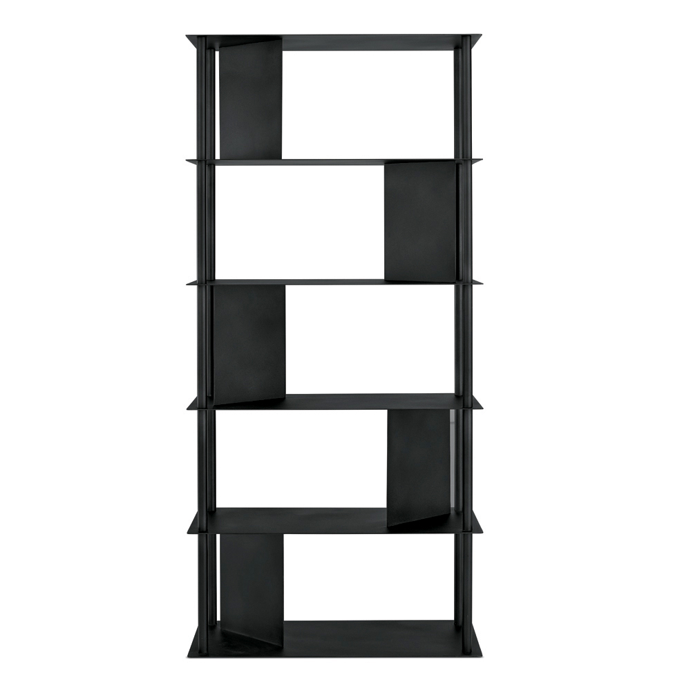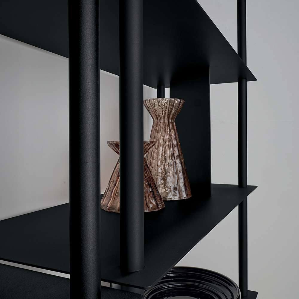 Das aus lackiertem Metall gefertigte Bücherregal besteht aus vier vertikalen, umlaufenden Rohren , die die Regalböden tragen. Dazwischen befinden sich schräge Platten , die den Raum strukturieren und als Ablage für Bücher und andere Gegenstände dienen. Diese Anordnung erzeugt ein raffiniertes Zusammenspiel von Masse und Leere und verleiht der Komposition Dynamik und Tiefe.