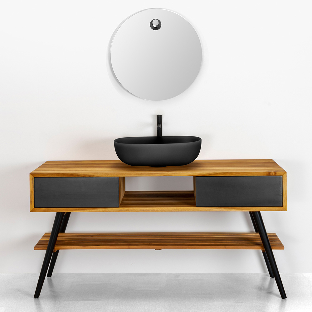 Badezimmerschrank aus natürlichem Teakholz mit schwarzen Beinen und Schubladen.