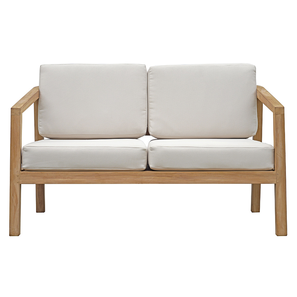 Das essentielle und harmonische Design hebt die Textur des Holzes hervor, während die großen und bequemen Sitze mit ecrufarbenem Stoffbezug dieses Set ideal für Momente purer Entspannung im Freien machen.