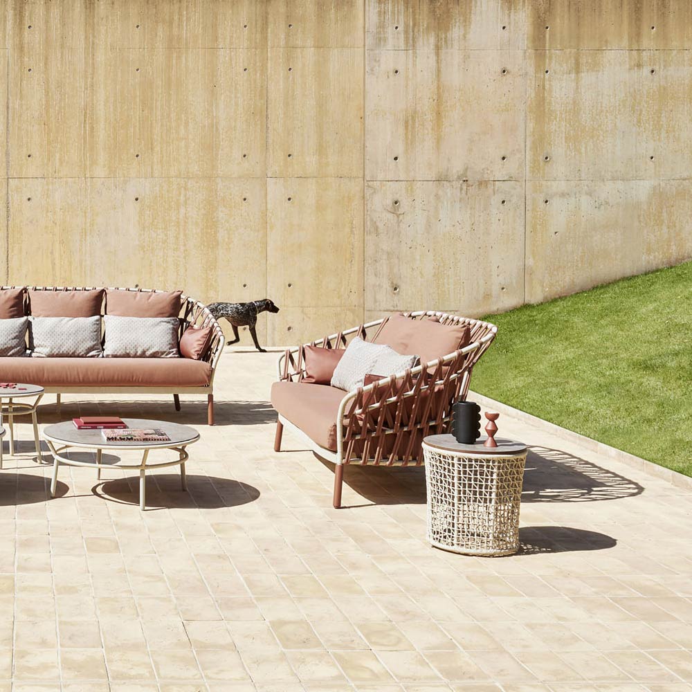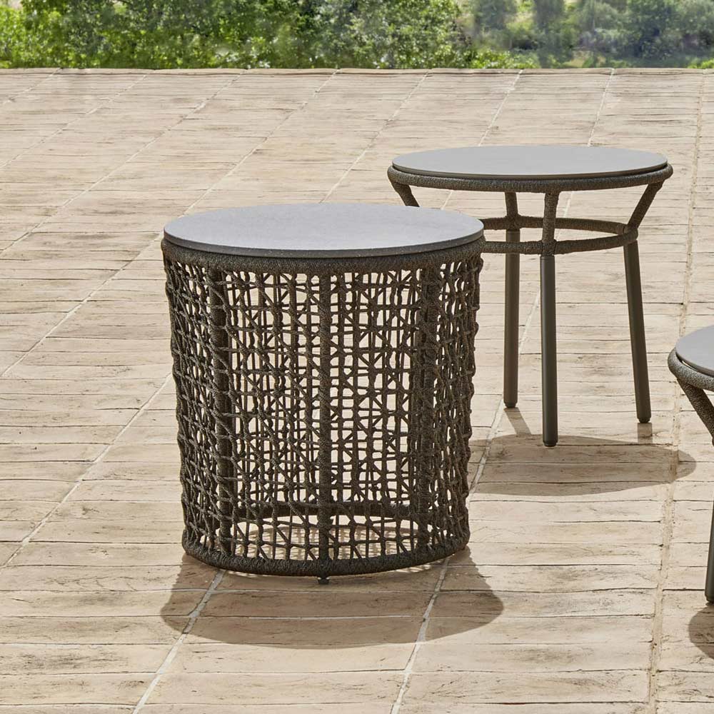 Outdoor-Couchtisch mit Aluminiumrahmen und Seilgeflecht Made in Italy.