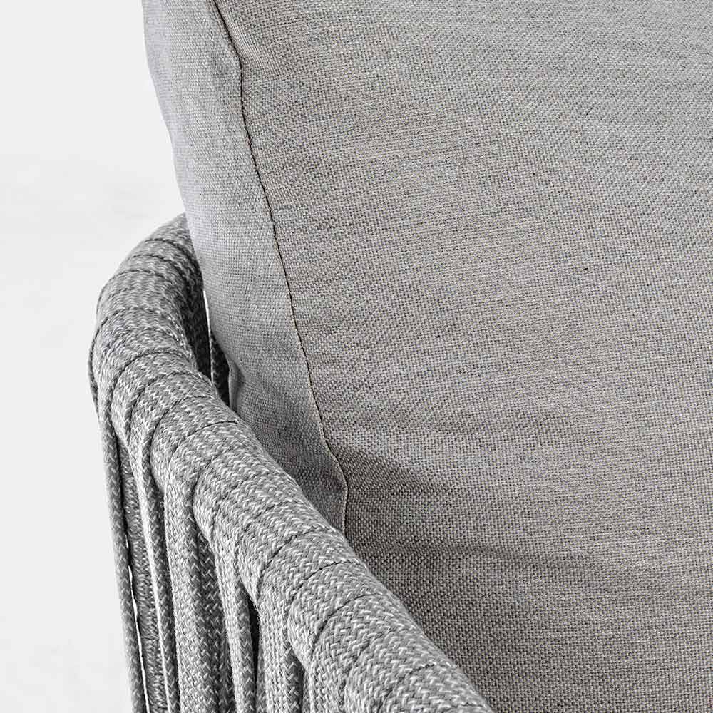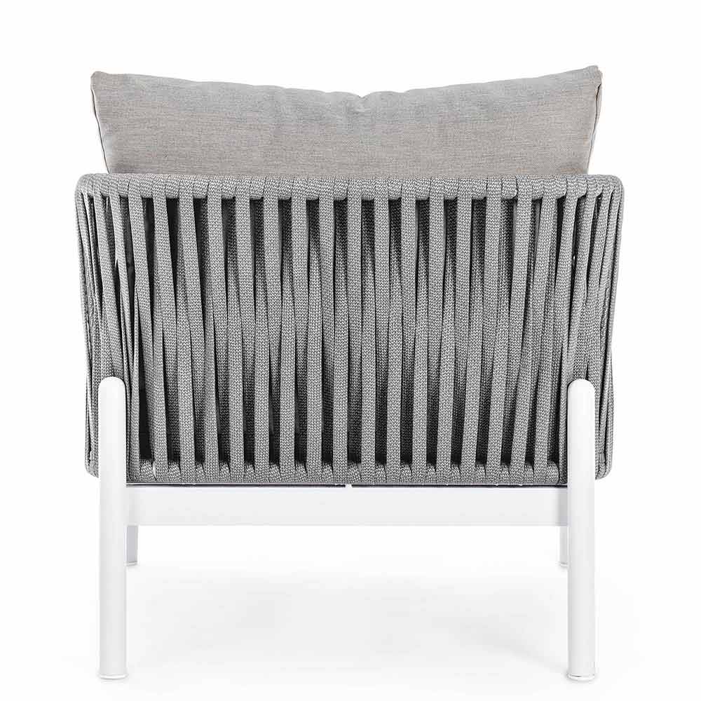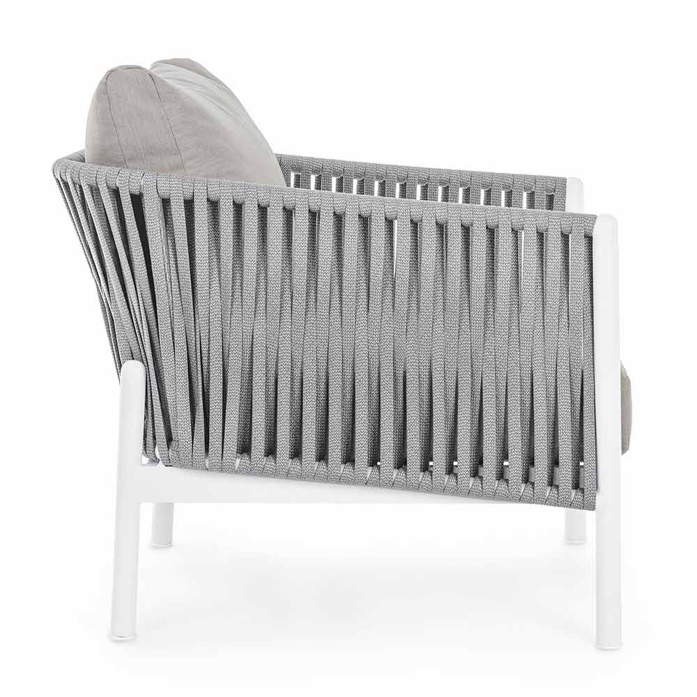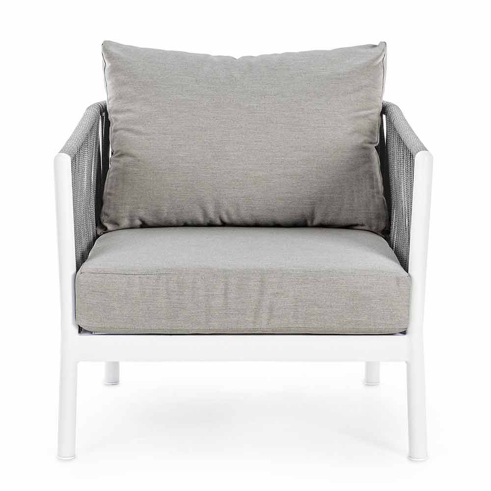 Outdoor-Design-Sessel mit weißer Aluminiumstruktur und abnehmbaren Kissen.