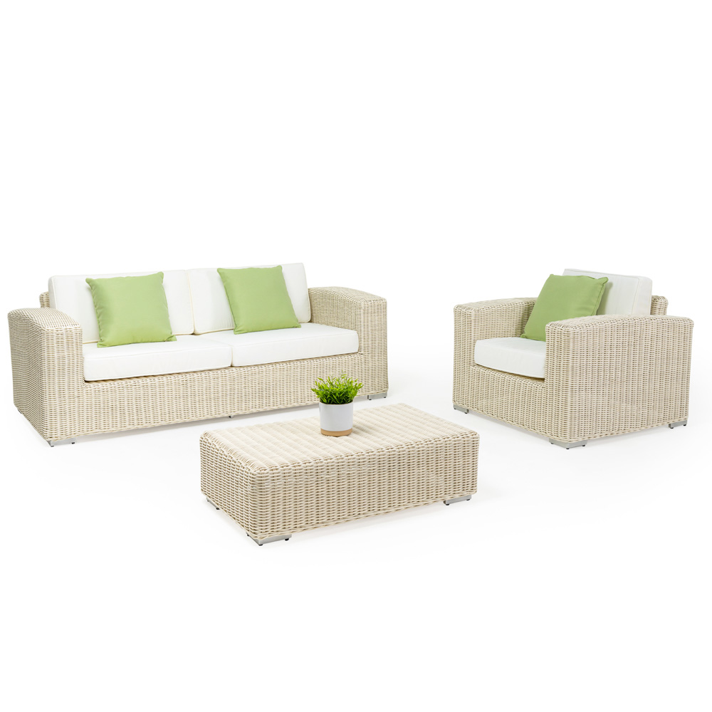 Der Outdoor-Sessel Yoko ist mit einem Aluminiumrahmen und manueller Flechtung von den besten Handwerkern in der in Polyrattan Faser Marke Rehau von höchster Qualität hergestellt. Dieser Sessel zeichnet sich durch sein lineares und minimalistisches Design, quadratische Linien und die Raffinesse des Geflechts aus. Die Sitz- und Rückenkissen in der Farbe off white sind im Lieferumfang enthalten.