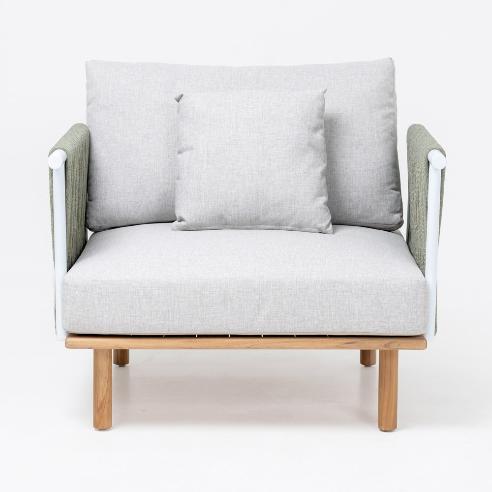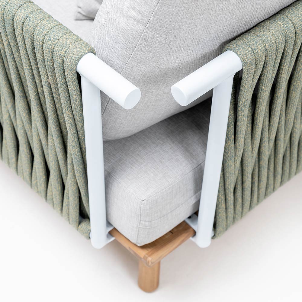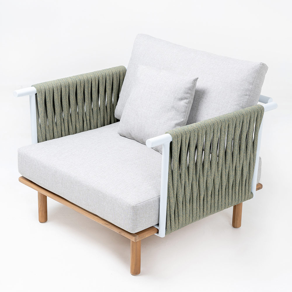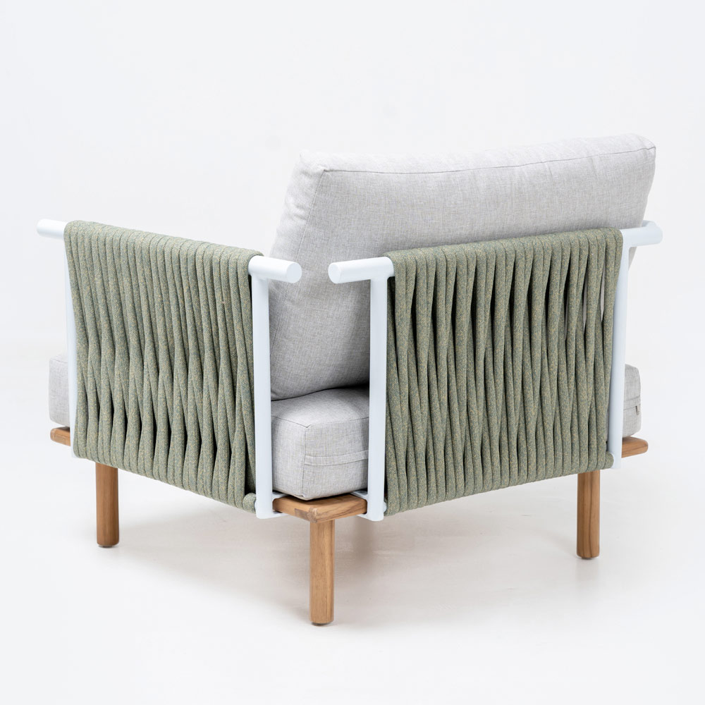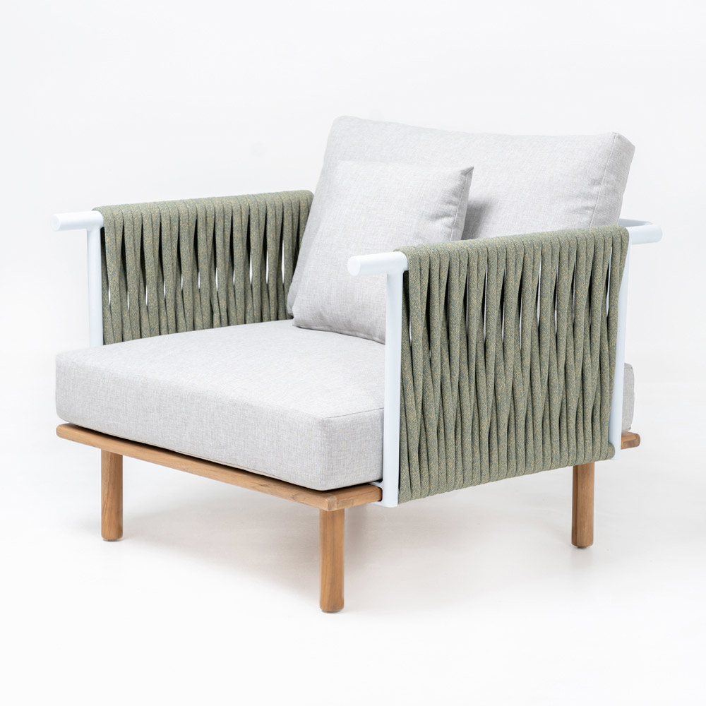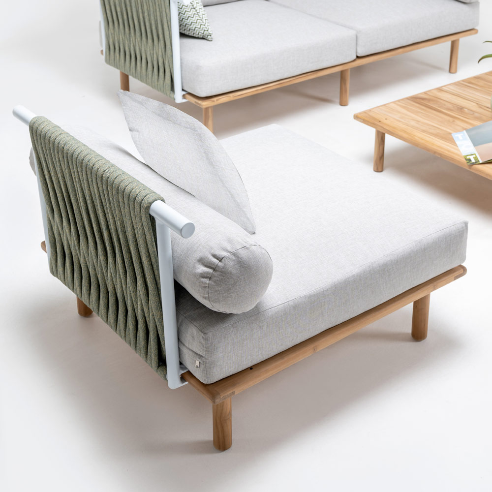 Outdoor-Sessel mit Struktur aus Teakholz und 1 Sitzkissen aus hellgrauem Olefin-Gewebe, 3 abnehmbare Rückenlehnen aus Aluminium und Olefin/PP ROPE-Geflecht mit Desert Mix Finish.