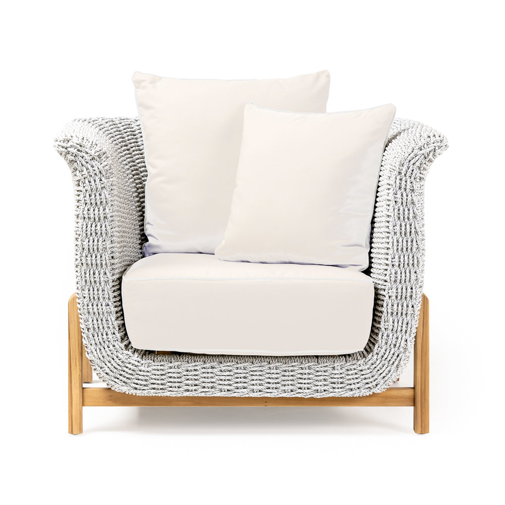 Dieser Sessel hat ein off-white farbiges Geflecht, während die Standardkissen in havanna grey Farbe sind.