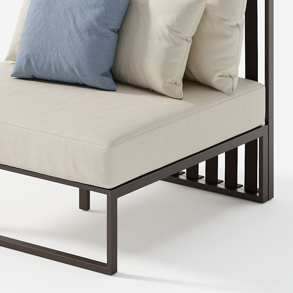 Gartensessel mit zentraler Struktur aus mit Epoxidpulver beschichtetem Aluminium (mit stoßfesten und kratzfesten Eigenschaften) und Polyestergurten mit Sitz und Rückenlehne in Kissen, die vollständig mit Irisun® Living Solids-Stoff bezogen sind . Made in Italy . Das Merkmal, das dieses Produkt einzigartig macht, ist der Wechsel von Körpern und Hohlräumen , der die Struktur aufhellt und sie im Raum schweben lässt. Dieses Einrichtungsset ist perfekt, um dem Raum eine einzigartige und raffinierte Note zu verleihen, und dank der verwendeten Materialien sind Qualität und Beständigkeit im Laufe der Zeit garantiert. Der Komfort des Sitzes ermöglicht es Ihnen, eine einladende und informelle Atmosphäre zu schaffen, die für alle Gelegenheiten geeignet ist.