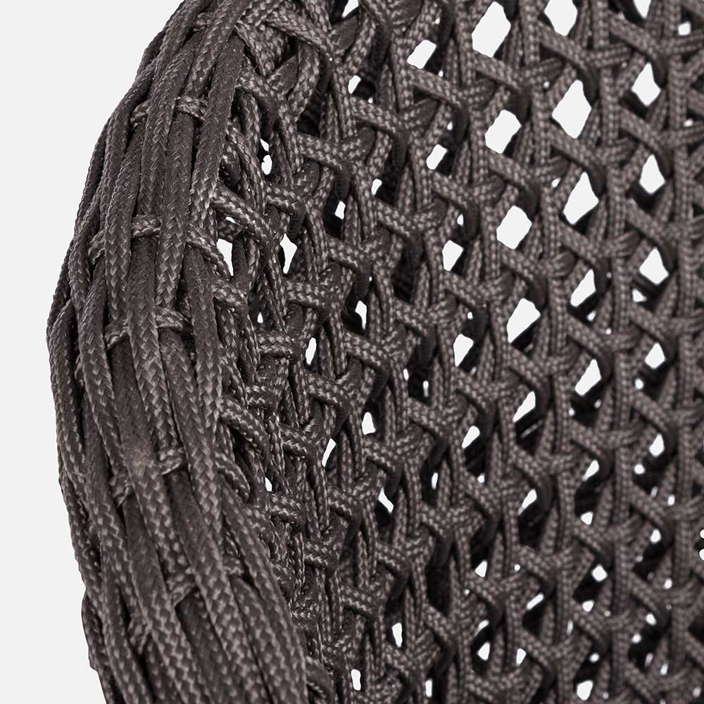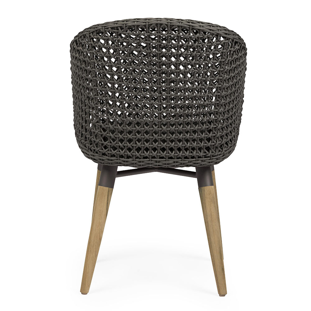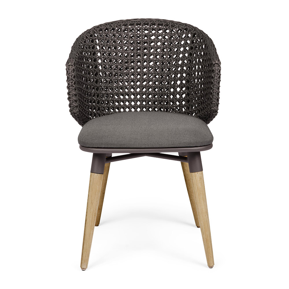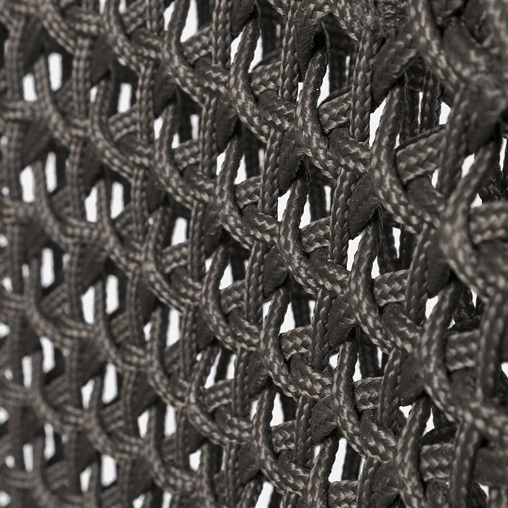Pulverbeschichtete (Polyester) Aluminiumstruktur (Guss). Teak Beine - SVLK (zertifiziertem Holz aus nachhaltiger Forstwirtschaft) mit rustikalem Abgang. Gewebt für den Außenbereich in Seilen (Polypropylen), wasserabweisend und UV-beständig. Nicht abnehmbarer Sitz mit schnell trocknender Schaumstoffpolsterung für den Außenbereich (Anti-Feuchtigkeit). Sunbrella Outdoor-Material (100% Acryl), wasserabweisend und UV-beständig.
