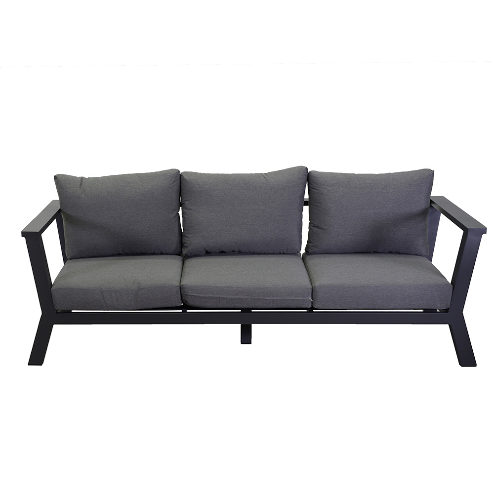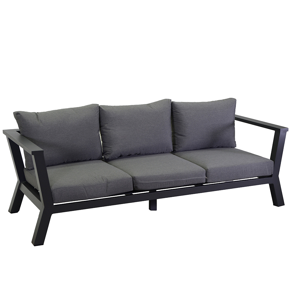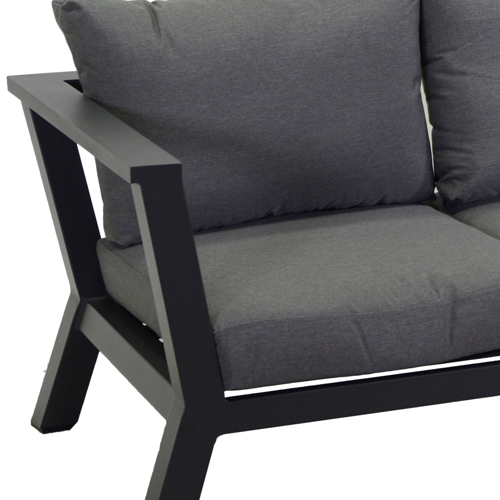 Dieses Sofa mit anthrazit pulverbeschichtetem Aluminiumrahmen ist der Inbegriff von moderner Eleganz und Funktionalität. Perfekt für jeden Außenbereich, bietet er eine geräumige und bequeme Sitzfläche, die durch graue Kissen aus Stoff bereichert wird, die für maximalen Komfort sorgen. Diese Kissen sind nicht nur ästhetisch ansprechend, sondern auch wasserabweisend und abnehmbar, was eine einfache Pflege und eine lange Lebensdauer gewährleistet.