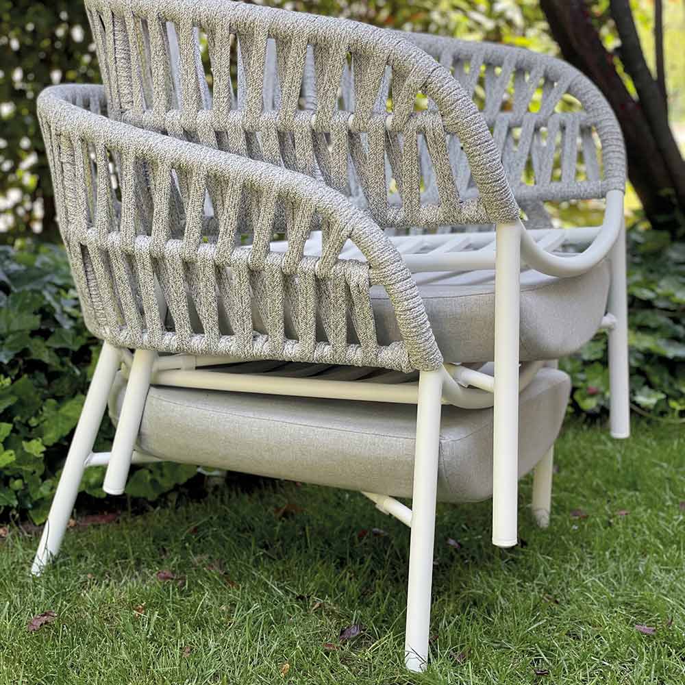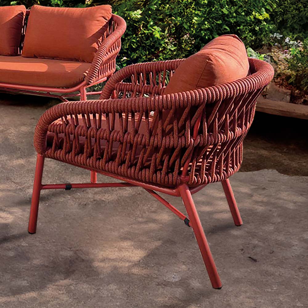 Dieser Gartensessel ist ein perfektes Beispiel für einladendes Design und raffinierte Handwerkskunst und eignet sich ideal für die Gestaltung einer Lounge-Ecke, die der Entspannung und dem Stil gewidmet ist. Die lackierte Aluminiumstruktur , leicht, aber widerstandsfähig, trägt elegant ein raffiniertes Gewebe aus Polyesterseil , das dem Sitz Bewegung und Persönlichkeit verleiht.