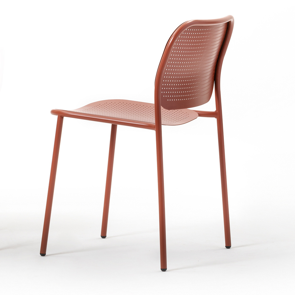 Gartenstuhl mit Struktur aus lackiertem Metallrohr, ergänzt durch Sitz und Rückenlehne aus perforiertem Blech , ein Effekt, der das klassische Wiener Geflecht in einem zeitgenössischen Schlüssel wieder aufgreift. Ein Möbelstück, das aus einem 100% Made in Italy-Produktionsprozess durch die Verwendung hochwertiger Rohstoffe stammt , die ein solides und widerstandsfähiges Ergebnis bieten.