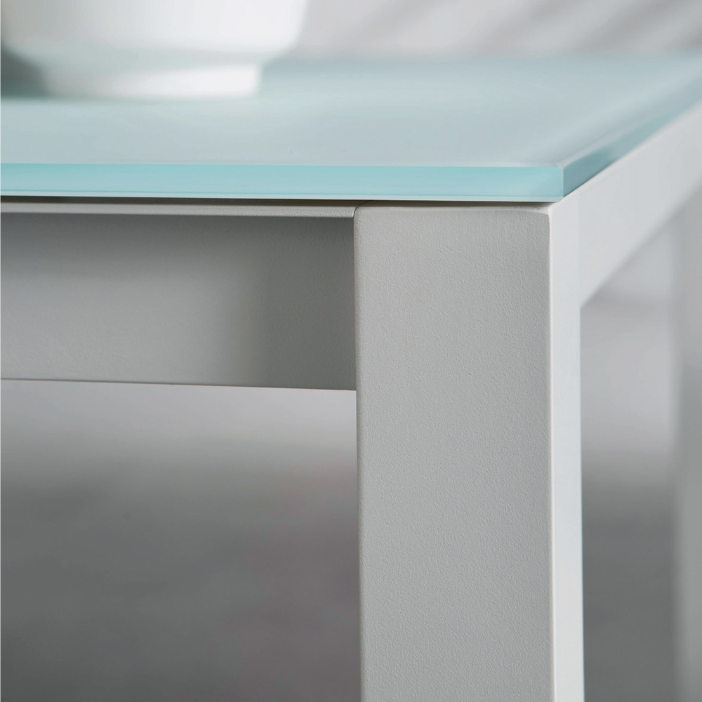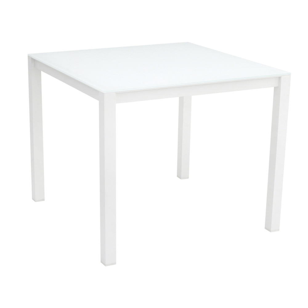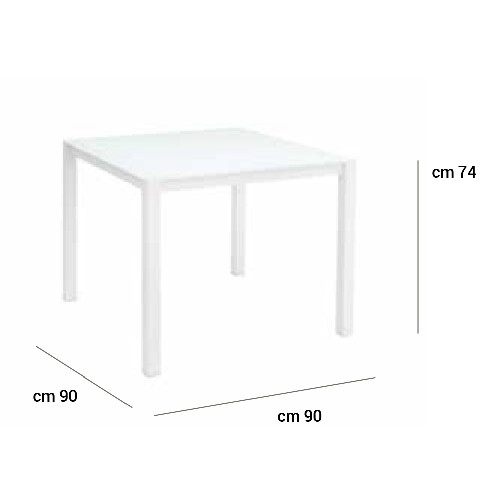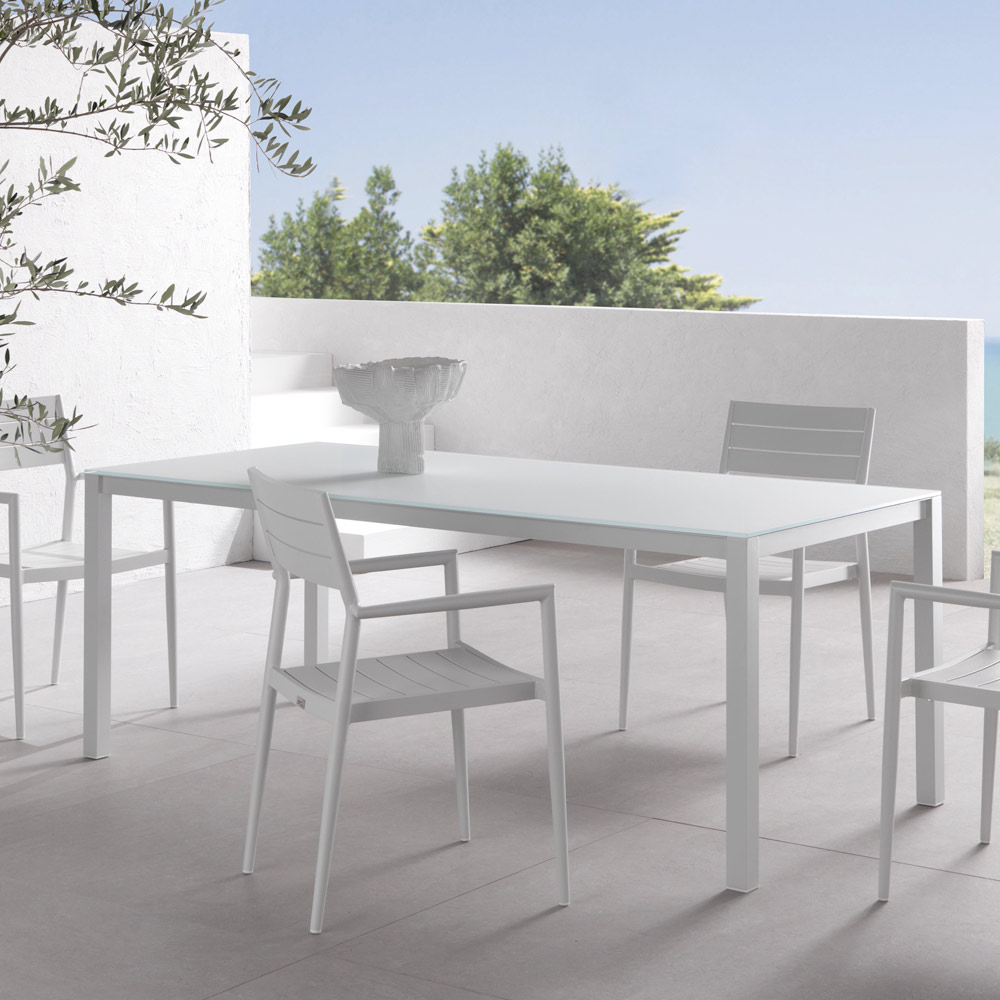 Garten-Esstisch aus epoxidpulverbeschichtetem Aluminium und hinterlackierter Glasplatte.Dieser Tisch zeichnet sich durch seine starken quadratischen Formen aus, die sich in jede Art von zeitgenössischer Außenumgebung einfügen und ihm einen starken modernen und persönlichen Charakter verleihen. Seine hochwertigen Materialien sind widerstandsfähig und langlebig.