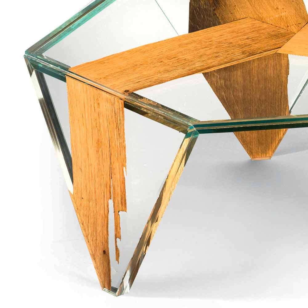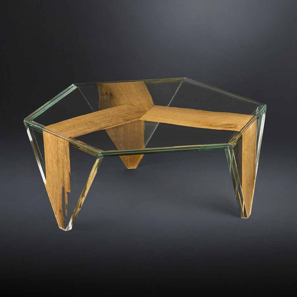 Couchtisch mit sechseckiger Plattevollständig in Italien hergestellt aus Verbundglas (10 + 10 mm), in das ein dünner Abschnitt aus Eichenholz Briccola eingelegt ist. Aus der Verbindung zwischen dem Charme des Holzes und seinen Maserungen, die an die Natur erinnern, und der zeitlosen Eleganz von Glas , das an die Transparenz des Wassers erinnert, entsteht ein exklusives Einrichtungsaccessoire , das sich durch eine starke, raffinierte Persönlichkeit auszeichnet. Seine Stärke wird durch die ursprüngliche Form und durch die wunderbare Kombination von Oberflächen und Materialien repräsentiert, die seinen Wert steigern, ohne jemals den grundlegenden funktionalen Aspekt zu vernachlässigen, der durch die 100% Made in Italy-Verarbeitung und die Verwendung hochwertiger Rohstoffe unterstrichen wird. um den perfekten Couchtisch anzubieten, der jeden Wohnbereich mit einem zeitgenössischen Geschmack stilvoll vervollständigt.