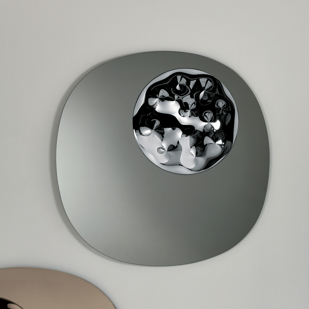 Das Design wird durch einen markanten, kreisförmigen Einsatz aus Ton-in-Ton-gebogenem Glas verziert, der an einer Seite des Rahmens angebracht ist. Dieses Detail erzeugt ein raffiniertes Spiel von Licht und Reflexionen, das die Spiegeloberfläche mit einer originellen und modernen Note bereichert.