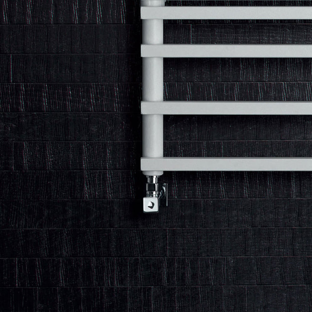 Gemischter Handtuchwärmer aus Kohlenstoffstahl mit BIGS-Finish , bestehend aus einer Reihe horizontaler Elemente mit einem quadratischen Querschnitt von 2 cm, die an vertikale Verteiler mit einem Durchmesser von 3,5 cm geschweißt sind. Komplett in Italien hergestellt, inklusive Wandbefestigungsset, Entlüftungsventil und Blindstopfen .