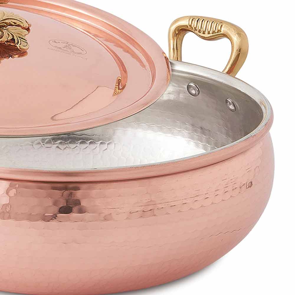 Gemüsegericht mit Deckel und Messinggriffen ist ein abgerundeter Topf aus gehämmertem massivem Kupfer, ideal zum langsamen Garen von Hülsenfrüchten, Fleischsauce und Wild usw.