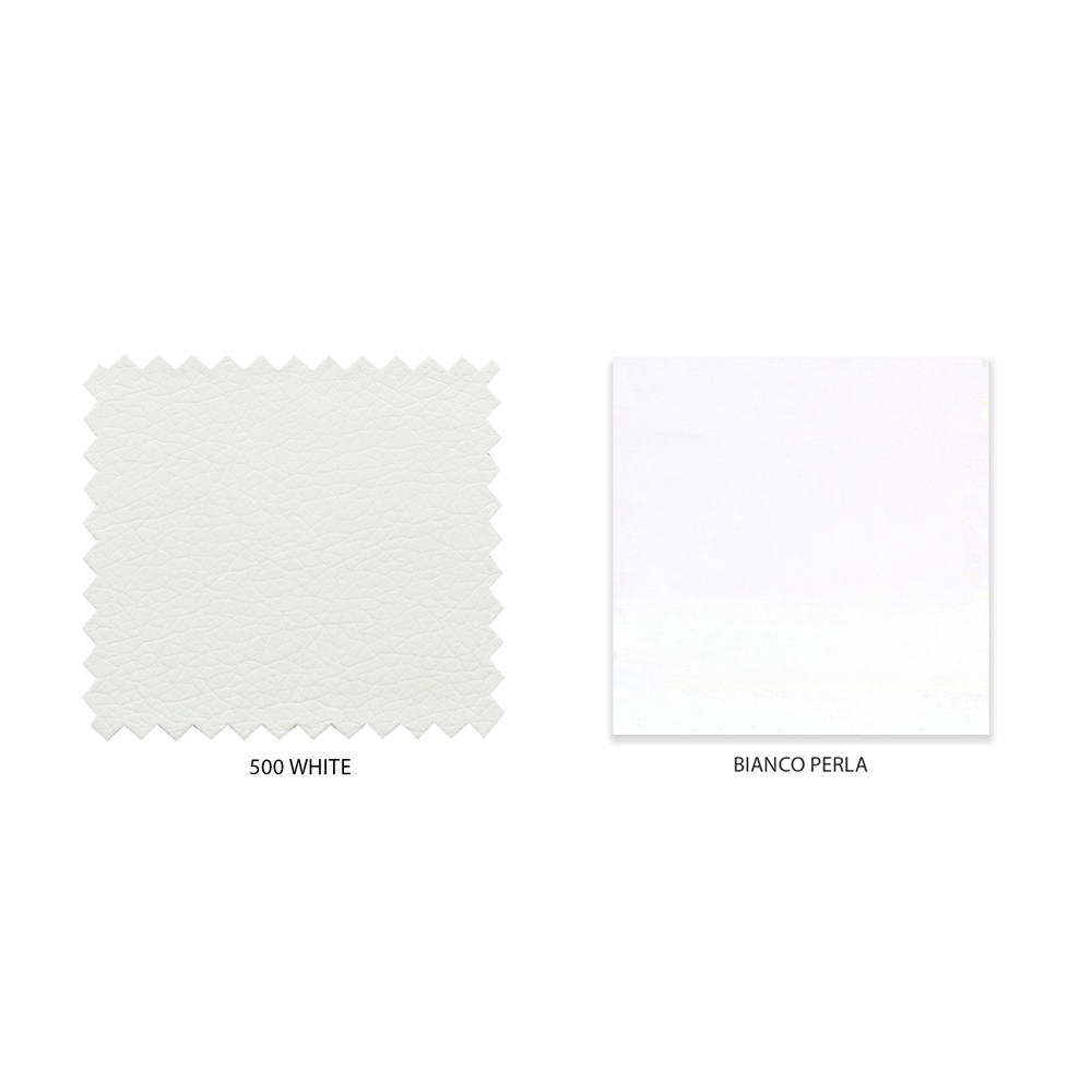 Doppelbett mit Struktur aus mitteldichter Holzfaserplatte (MDF) und Bezug aus weißem Ökoleder. Bei der Containervariante bestehen die Containerböden aus hochdichter Faserplatte (HDF) aus hochdichtem Pressholz .