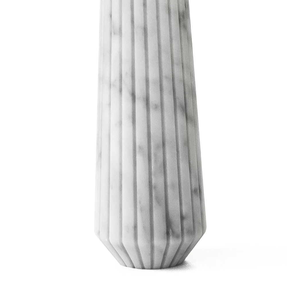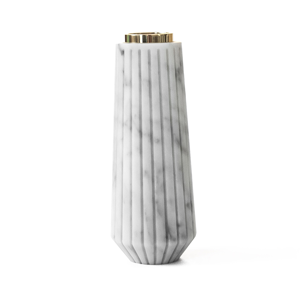 Großer gestreifter Kerzenhalter aus weißem Carrara-Marmor und Messing, hergestellt in Italien.
