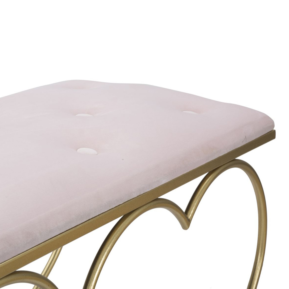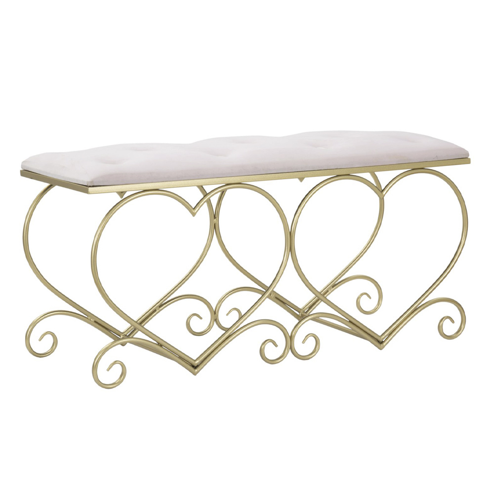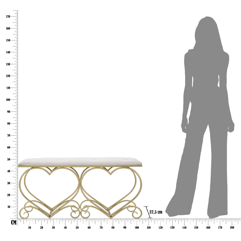 Moderne Bank aus Eisen mit goldenem Finish mit Sitzfläche aus Schwamm gepolstert und mit Stoff bezogen . Ein Möbelstück mit verträumter Seele , gekennzeichnet durch die besondere Herzform des Sockels , die die Ästhetik bereichert und sie einzigartig und elegant macht . Die wundervolle Kombination der gewählten Farben vervollständigt den endgültigen Look und macht diese Bank zu einem idealen Dekorationselement für diejenigen, die einen romantischen Stil suchen und ihre Wohnräume gerne mit Objekten mit einer starken, raffinierten Persönlichkeit ausstatten.