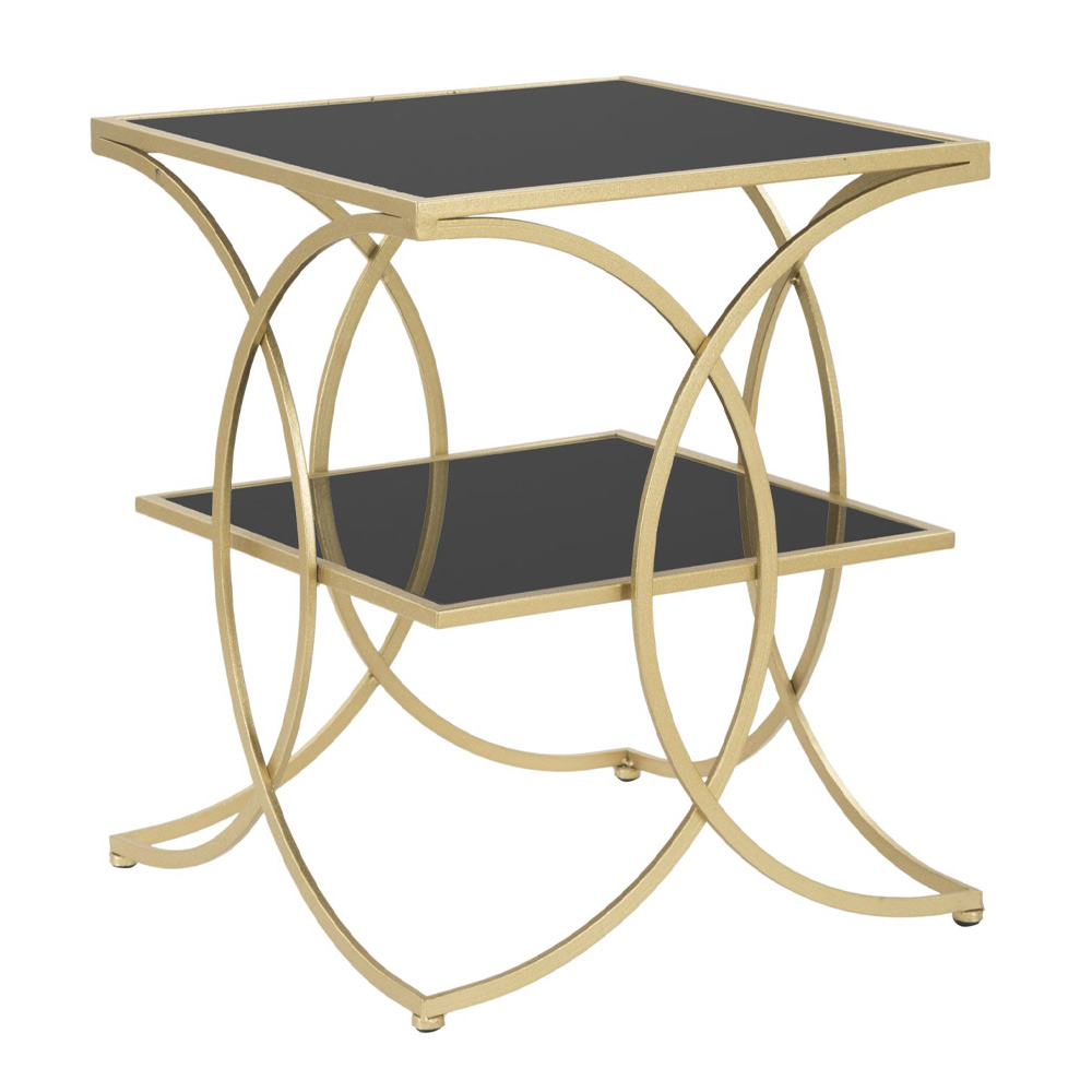 Couchtisch mit goldfarbener Eisenstruktur und 2 schwarzen Glasplatten . Eine Ergänzung, die sich durch ein einfaches und vielseitiges Design auszeichnet, aber gleichzeitig exklusiv und avantgardistisch. Seine Stärke ist die Einzigartigkeit, die durch die perfekte Kombination aus dem Hauch von Eleganz des goldenen Sockels und dem raffinierten Element des schwarzen Glases entsteht. Auffallend an seiner Ästhetik ist die Verwendung von weichen Formen und geschwungenen Linien , die einen raffinierten und eklektischen Couchtisch zum Leben erwecken, der sich dank seiner Vielseitigkeit und seines zeitgenössischen Charakters jeder modernen stilistischen Situation anpassen kann.
