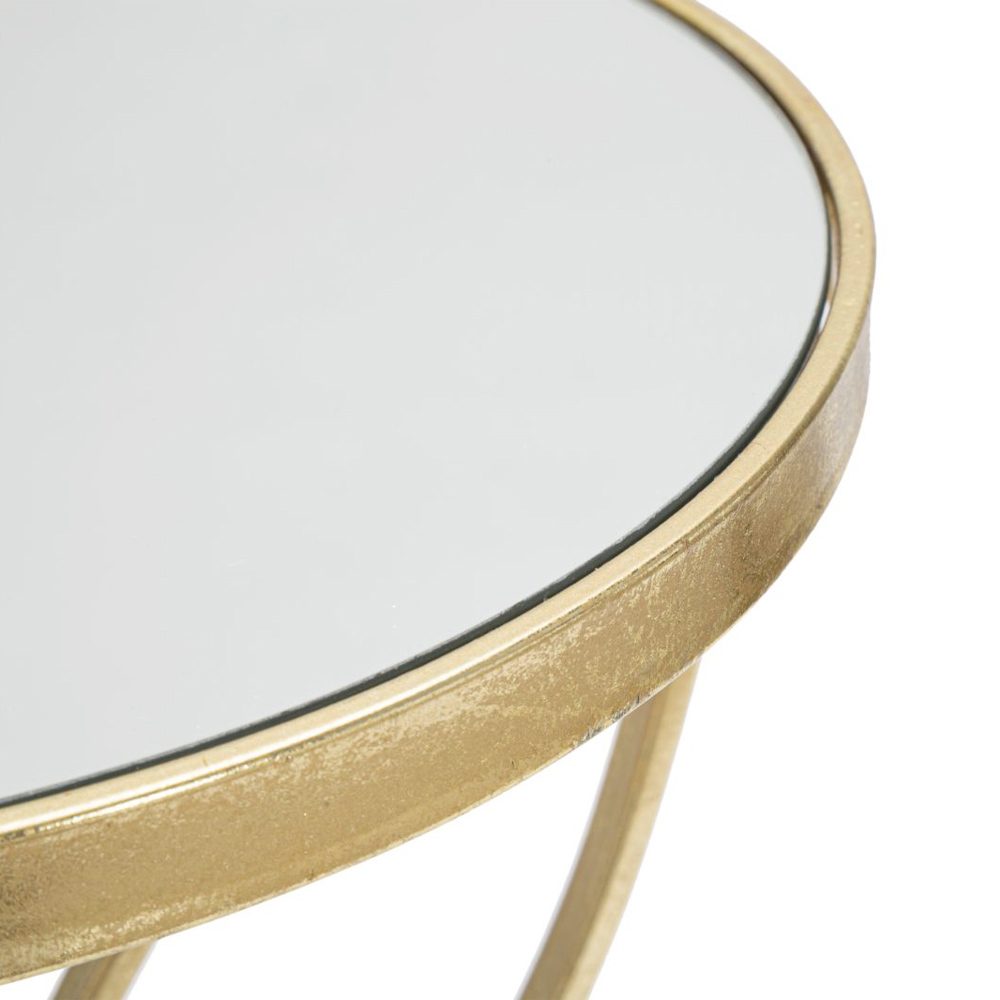 Couchtisch mit goldfarbener Eisenstruktur und runder Spiegelplatte . Ein Objekt mit einem einfachen und vielseitigen Design, das entworfen wurde, um Lounges im eleganten Stil mit Charakter und Persönlichkeit für ein exklusives und raffiniertes Ergebnis zu vervollständigen. Seine Besonderheit ist die wunderbare geometrische Textur, die die gesamte Struktur charakterisiert und ihren Wert und ihre Einzigartigkeit zusammen mit der raffinierten Spiegelplatte erhöht, die ihre anspruchsvolle Ästhetik unterstreicht.