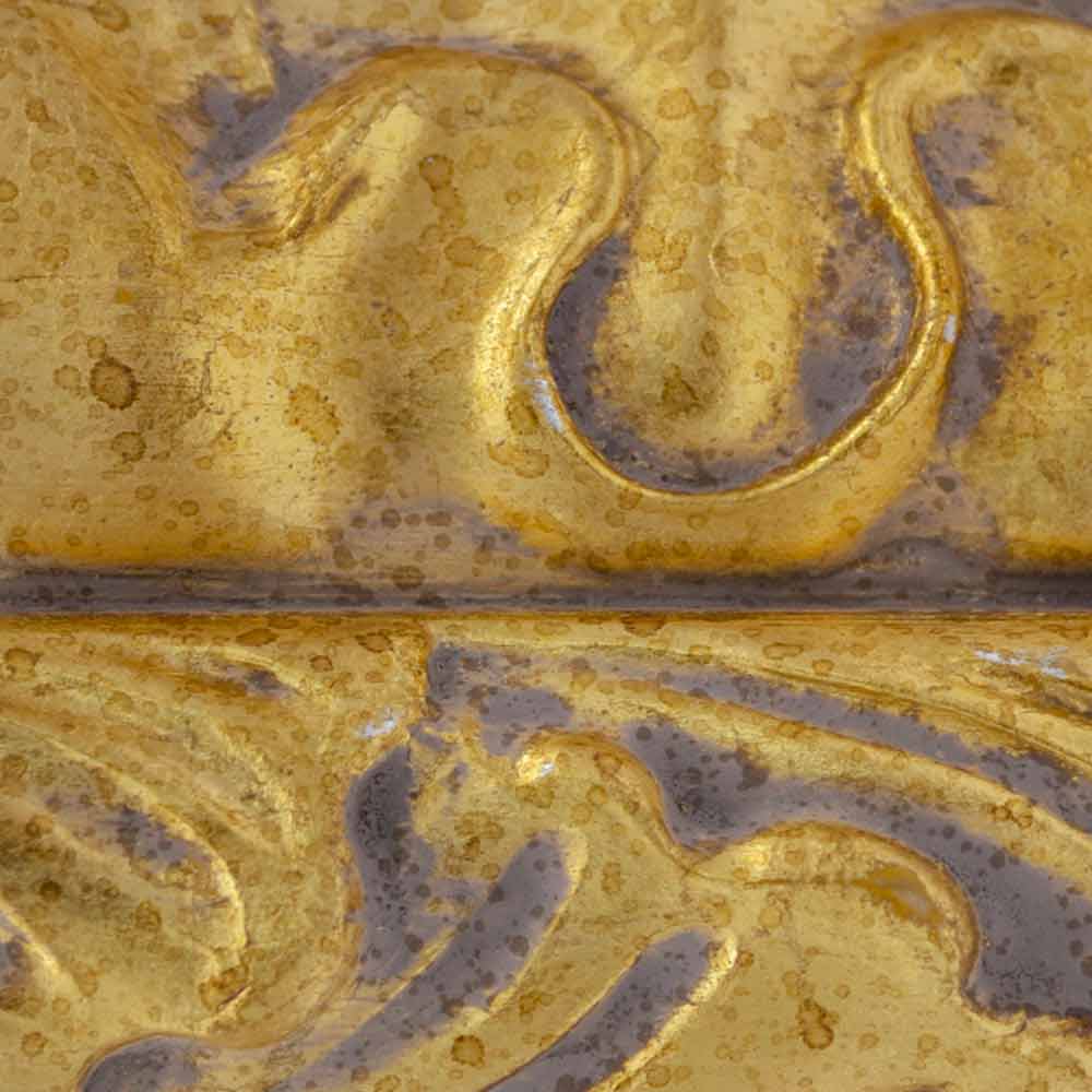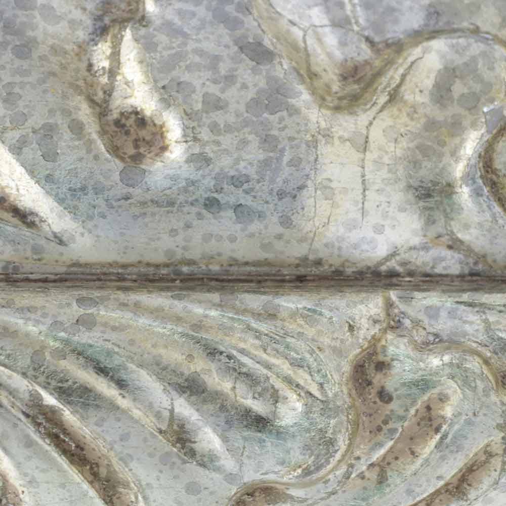 Dieser elegante Spiegel ist ein Design-Meisterwerk, das Funktionalität und dekorativen Stil vereint . Der Rahmen ist mit ineinander verschlungenen Blumenmotiven fein gearbeitet und fügt sich perfekt in den modernen Blumenhintergrund ein, auf dem er platziert ist, wodurch ein optisch anregender Kontrast entsteht. Die Handwerkskunst ist in jedem Detail spürbar , vom zarten Spiel von Licht und Schatten, das die Oberfläche bietet, bis hin zur Präzision der Gravuren, die die Kanten schmücken.