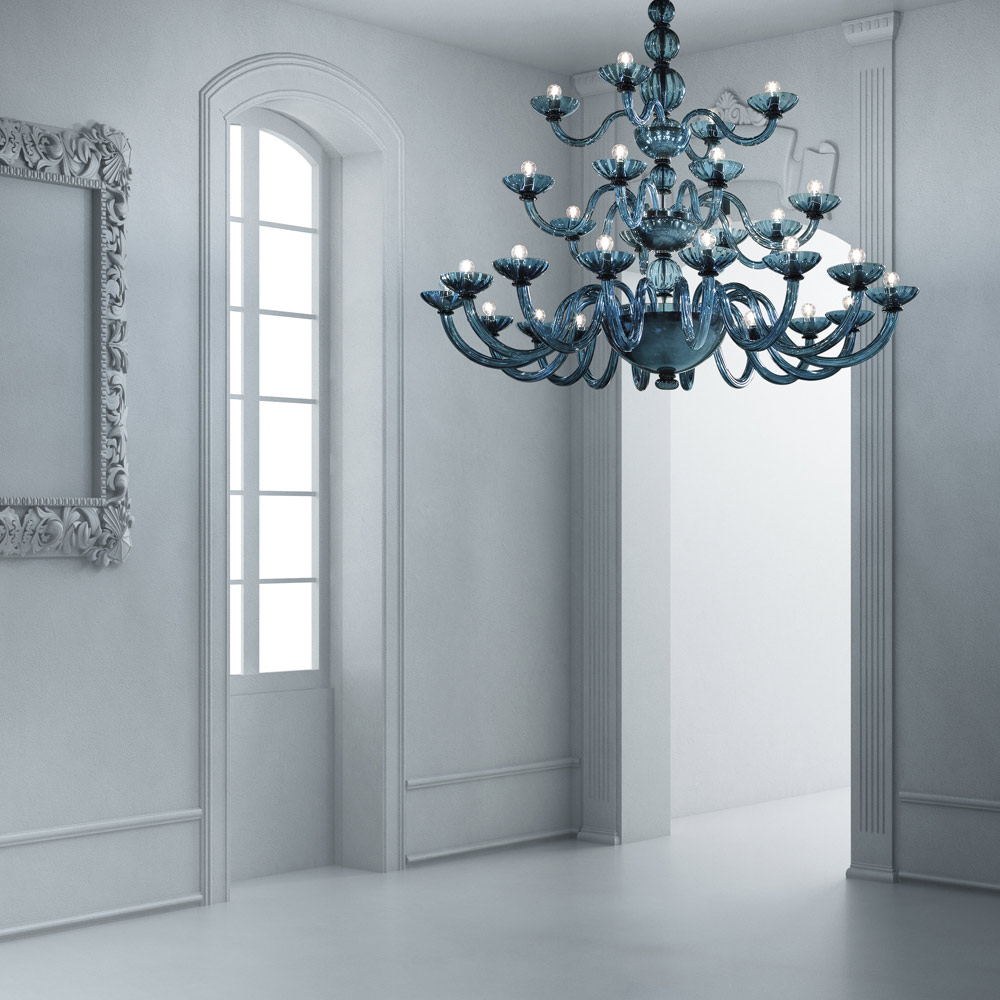 Handgefertigter 28-flammiger Kronleuchter aus venezianischem Glas mit Denim-Finish mit Bleianhängern und Details aus poliertem, verchromtem Metall . Ein Möbelstück mit einer erstaunlichen und ikonischen Präsenz, das sich durch eine weiche und zarte Linie und raffinierte Rundungen auszeichnet, die sich perfekt an klassische Umgebungen, aber gleichzeitig auch an Räume mit zeitgenössischem Stil anpassen. Das Element der Tradition wird durch seine wunderbaren Komponenten aus vollständig von Hand gefertigtem mundgeblasenem Glas unterstrichen, das sich dank trendiger Farben verwandelt, um sich selbst zu aktualisieren. Seine umhüllenden Formen machen es zu einem idealen Element, um jede Wohn- und Objektumgebung mit Klasse und Dynamik zu besetzen.