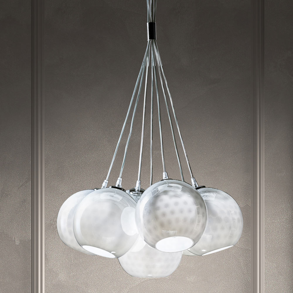 Eine Ergänzung mit einer originellen und raffinierten Seele aus geschichtetem oder transparentem Glas, das mit der Balloton-Technik bearbeitet wurde , für diejenigen, die eine Beleuchtung mit imposantem Charme und gleichzeitig besonders originell und zeitgemäß suchen.