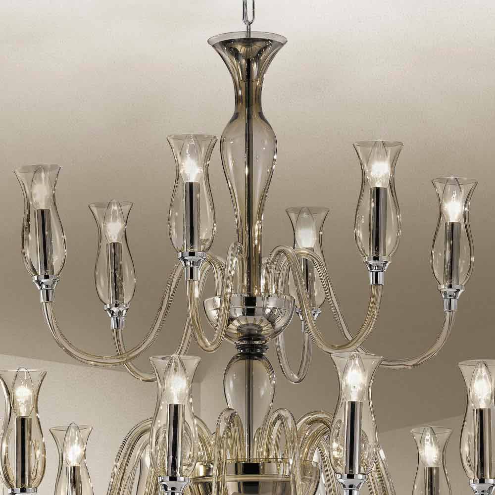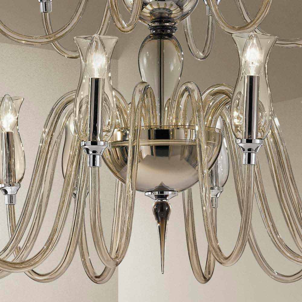 Feiner und filigraner 18-flammiger Kronleuchter aus Venedig-Glas in Rauchoptik mit polierten verchromten Metalldetails , Made in Italy . Aus der Neuinterpretation der klassischen und edlen Glasformen entsteht eine neue Schönheitsformel , die sich durch geschwungene und essentielle Linien auszeichnet, die traditionelle Formen neu definieren und einer Einrichtungslösung Leben einhauchen, die jede Umgebung mit Persönlichkeit vervollständigen kann. Was die Ästhetik bereichert , ist die glatte Oberfläche des Glases , die das Licht in verschiedene Richtungen gleiten lässt für Transparenzspiele , die sich mit den lebendigen Lichteffekten für ein exklusives Ergebnis mit starker visueller Wirkung verbinden .