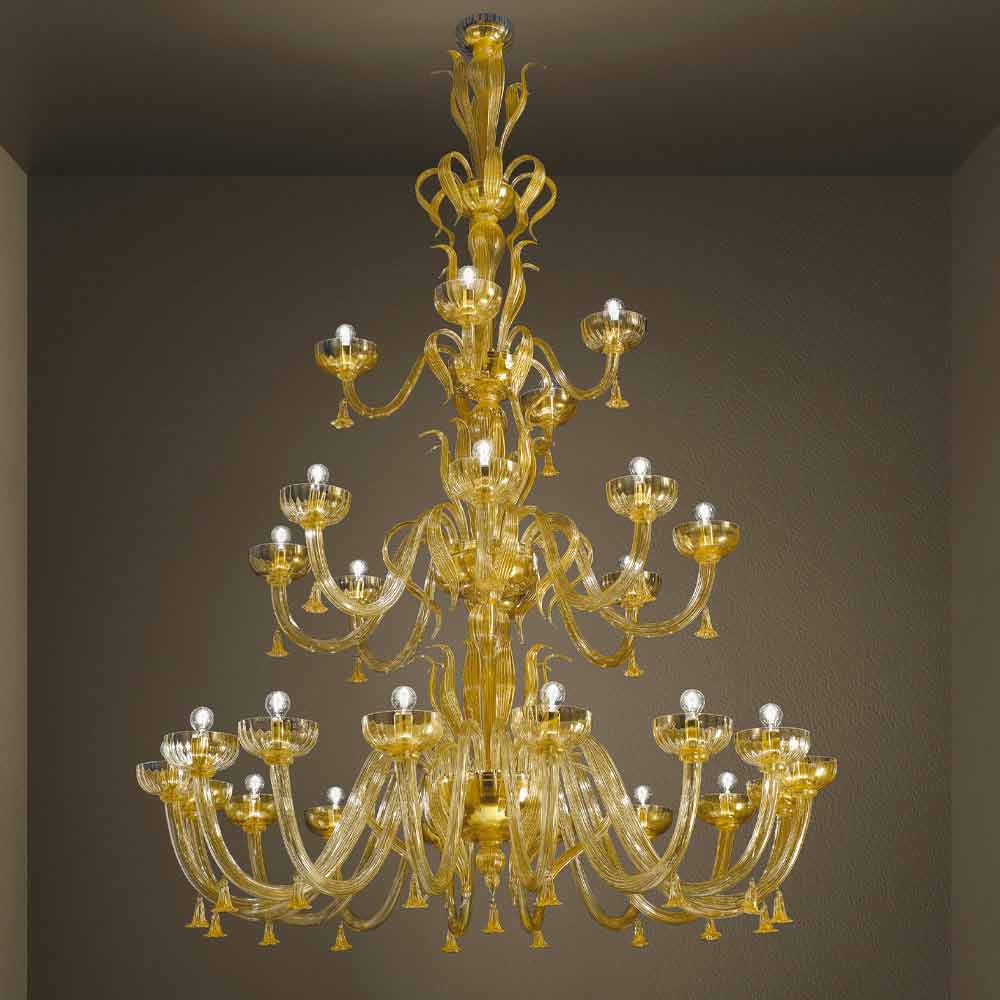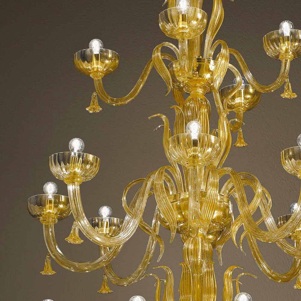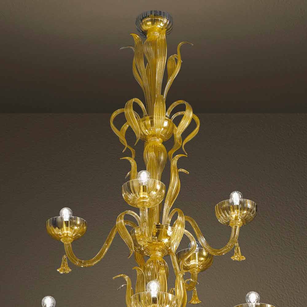 Handgefertigter Kronleuchter mit 28 Lichtern aus Venedig Glas und 24 Karat Gold, Made in Italy.