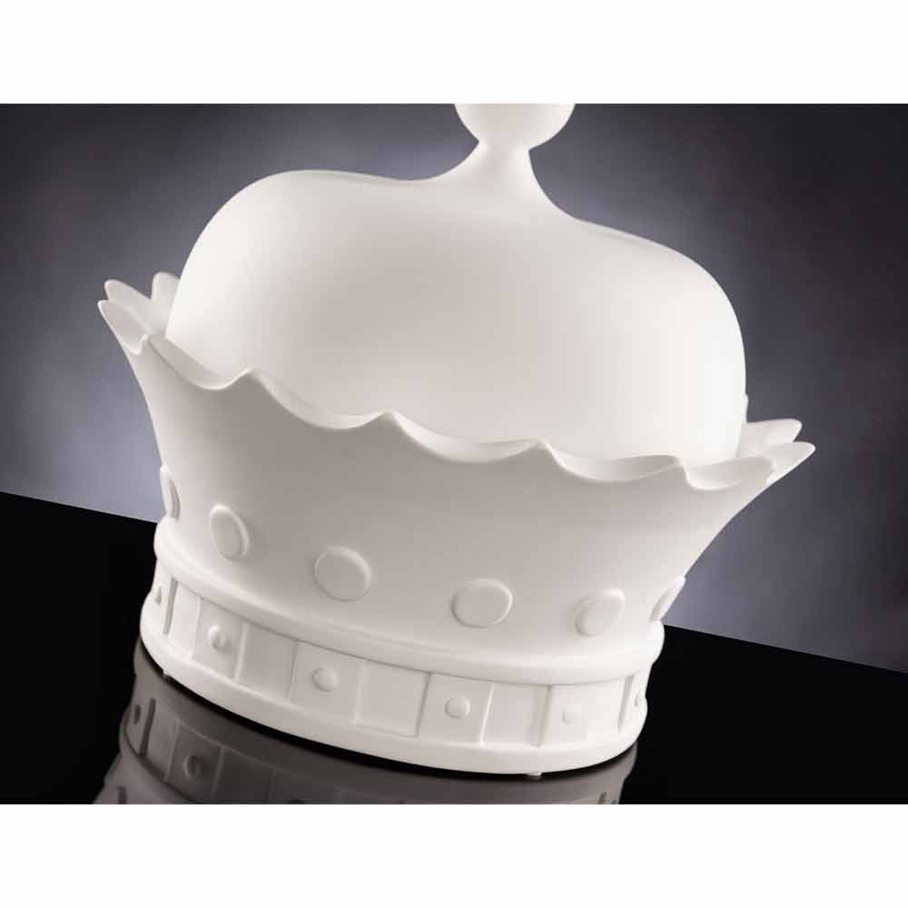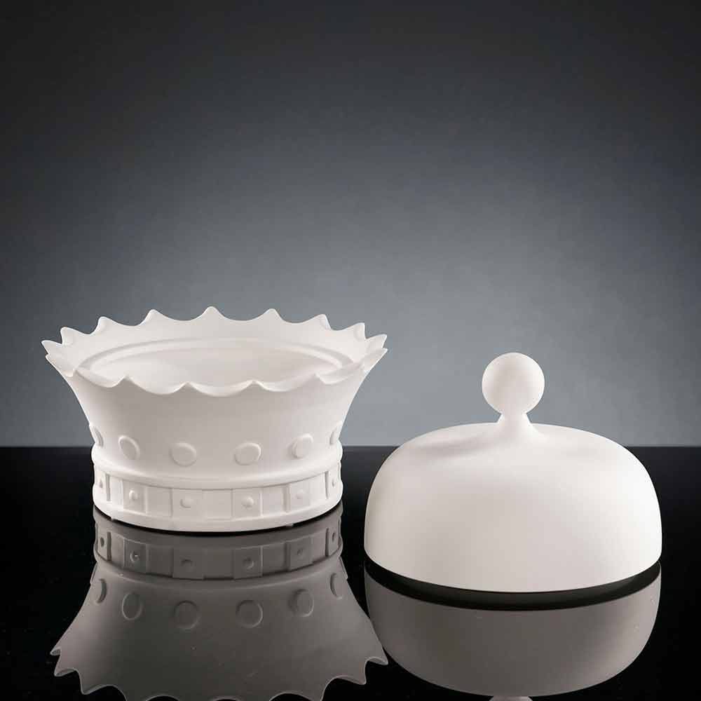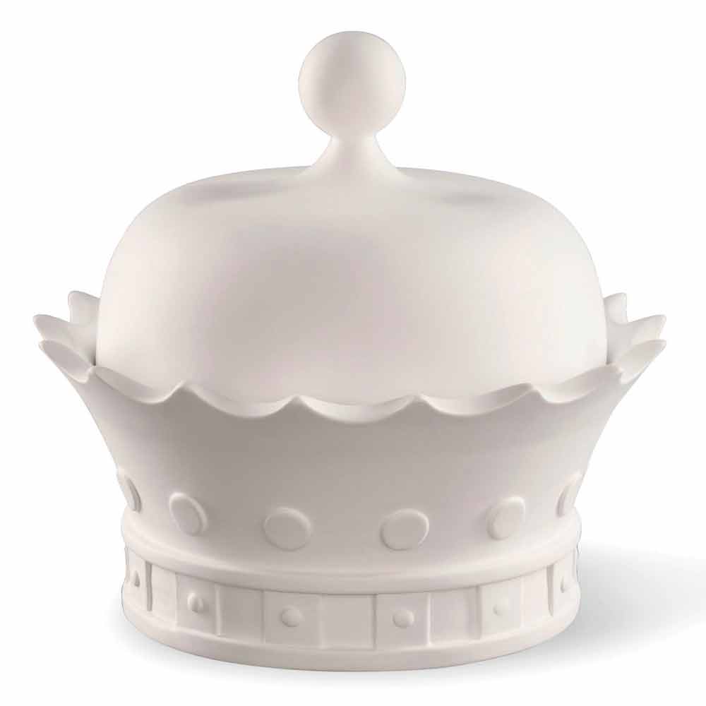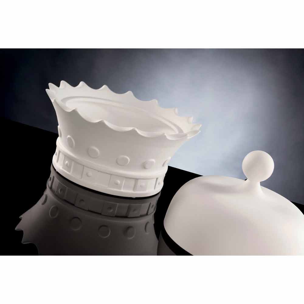 Dekorative Statuette in Form einer Königskrone mit Öffnung, hergestellt in Italien aus weißer handgemachter Keramik. Ein exzentrisches und elegantes Ornament, das gleichzeitig die umgebende Einrichtung vervollständigt, indem es eine wunderbare Harmonie schafft, die Modernität und Design verkörpert. Seine originelle und kreative Form ist ideal für diejenigen, die es lieben, ihre Wohnräume mit Elementen zu bereichern, die sich durch eine originelle und einzigartige Seele auszeichnen, während sie dank des praktischen Fachs unter dem Deckel wenig Platz zum Packen und Ordnen von Gegenständen bietet.