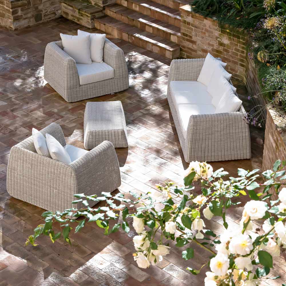 Das Outdoor-Wohnzimmer Charlie ist mit einem Aluminiumrahmen für alle seine Komponenten und manuellem Weben von den besten Handwerkern in der in Polyrattan Faser Marke Rehau von höchster Qualität durchgeführt. Es zeichnet sich durch die verjüngte Form der Armlehnen und die leicht abgerundete Linie. Die Sitz- und Rückenkissen sind im Lieferumfang enthalten und aus weißem Standardstoff.