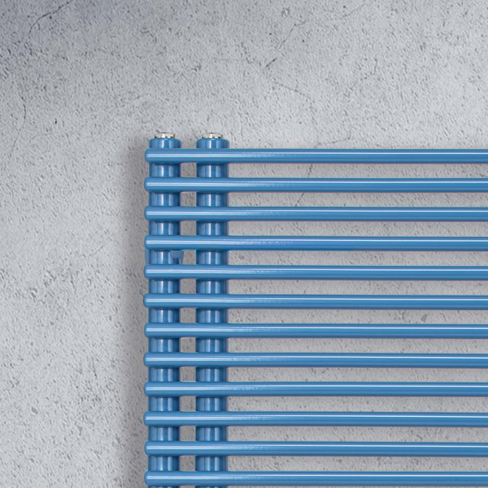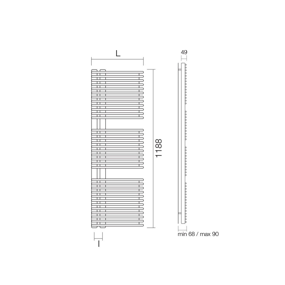 Hybrid-Handtuchwärmer aus Kohlenstoffstahl mit BGPS-Oberfläche , bestehend aus einer Reihe horizontaler Elemente mit einem Durchmesser von 1,6 cm, die an vertikale Verteiler mit einem Durchmesser von 3,5 cm geschweißt sind. Komplett in Italien hergestellt, inklusive Wandbefestigungsset, Entlüftungsventil und Blindstopfen .