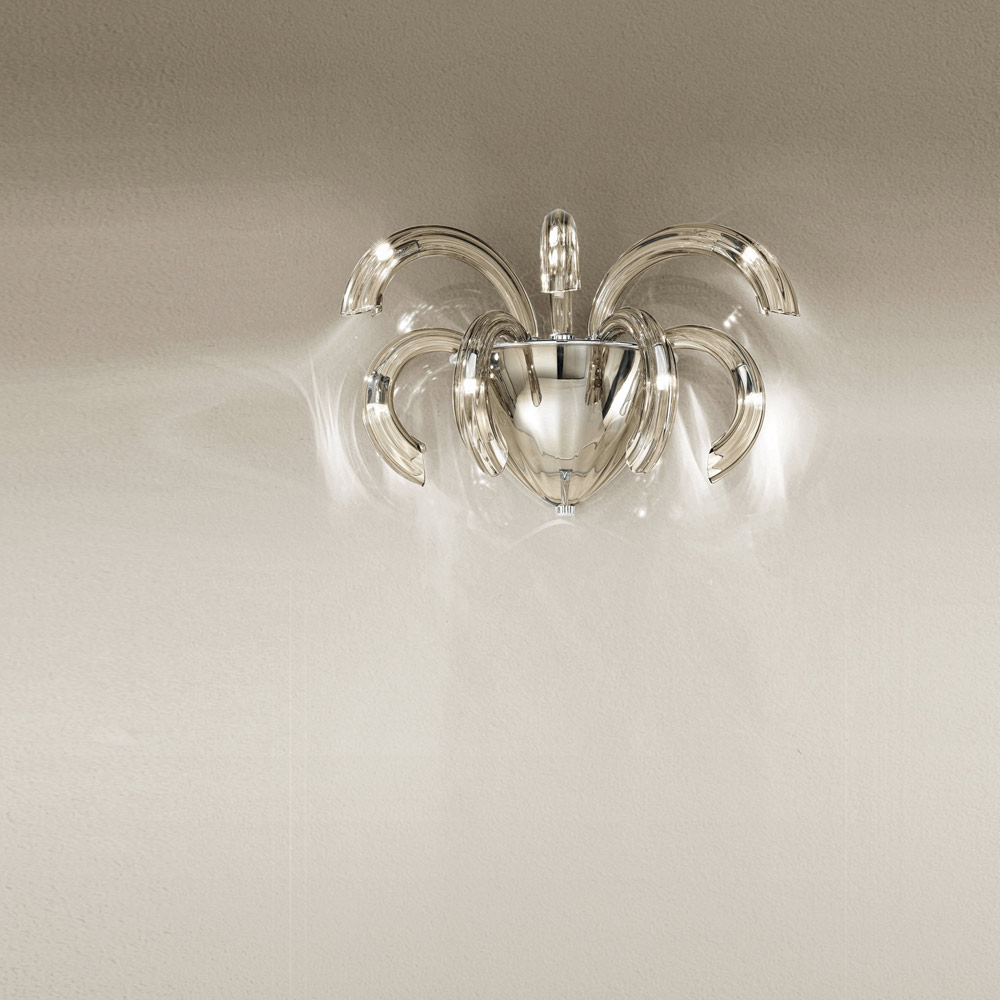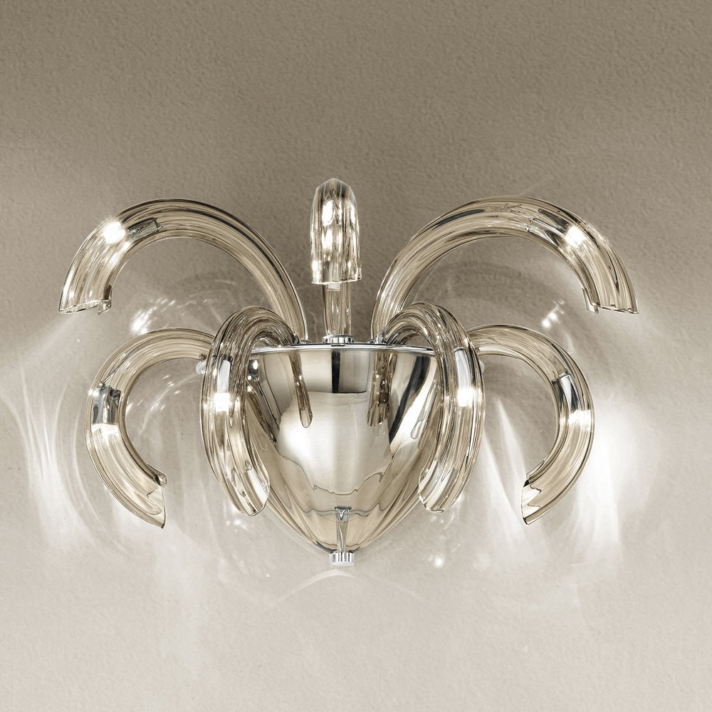 In Italien handgefertigte Wandlampe aus venezianischem Glas, geräuchertes Finish mit verchromten Metalldetails . Eine faszinierende Ästhetik, die sich dank ihrer Formen und der Funktionalität ihres Designs an jede Art von Umgebung anpasst, in die sie sich mit Überschwänglichkeit einfügt. Die wunderschönen und elegant geschwungenen Arme erweitern sich nach außen, um Licht in verschiedene Richtungen zu bringen und den Raum durch einen originellen szenografischen Effekt zu beleuchten, der an die Explosion eines Feuerwerks erinnert, um ein kreatives , raffiniertes und starkes visuelles Ergebnis zu erzielen.