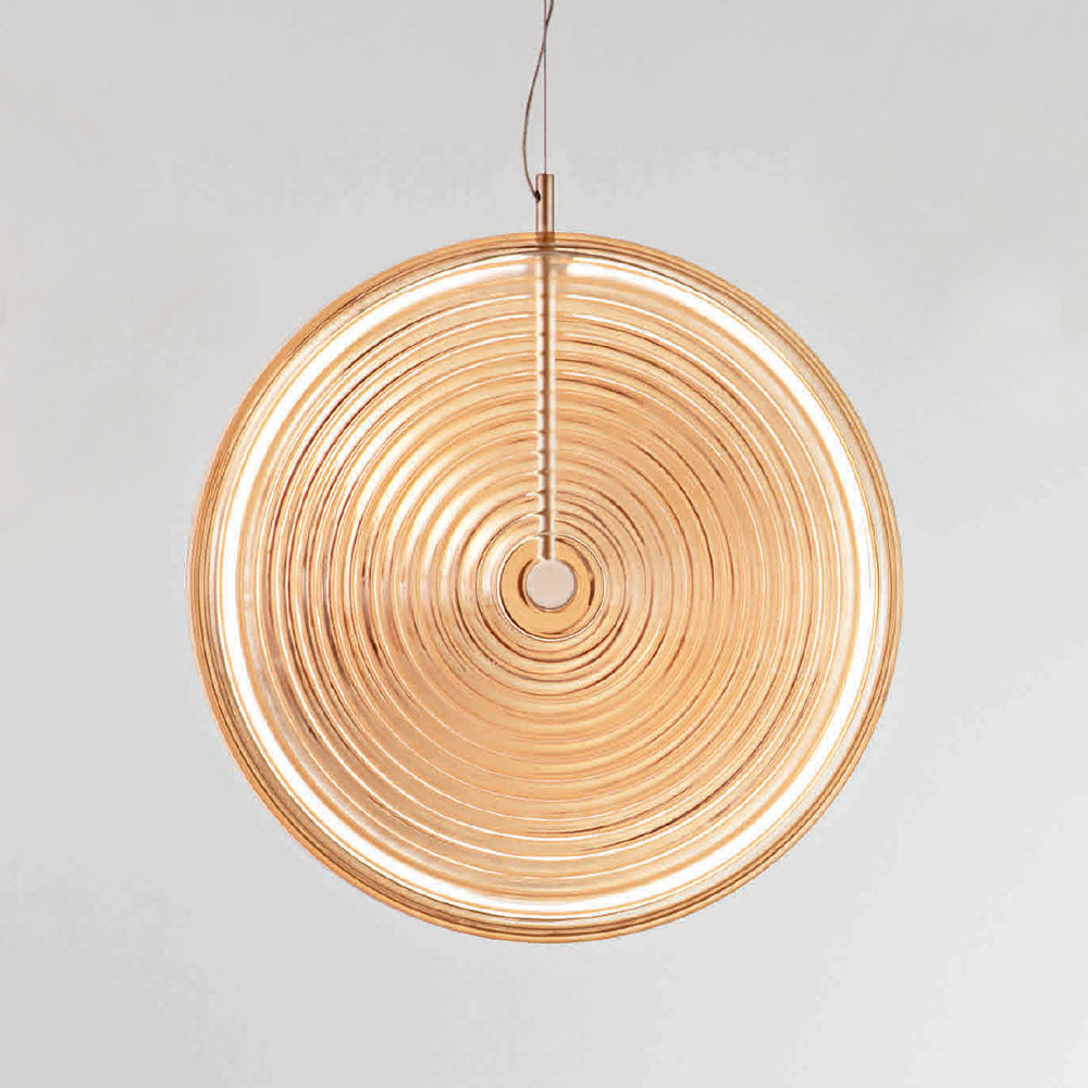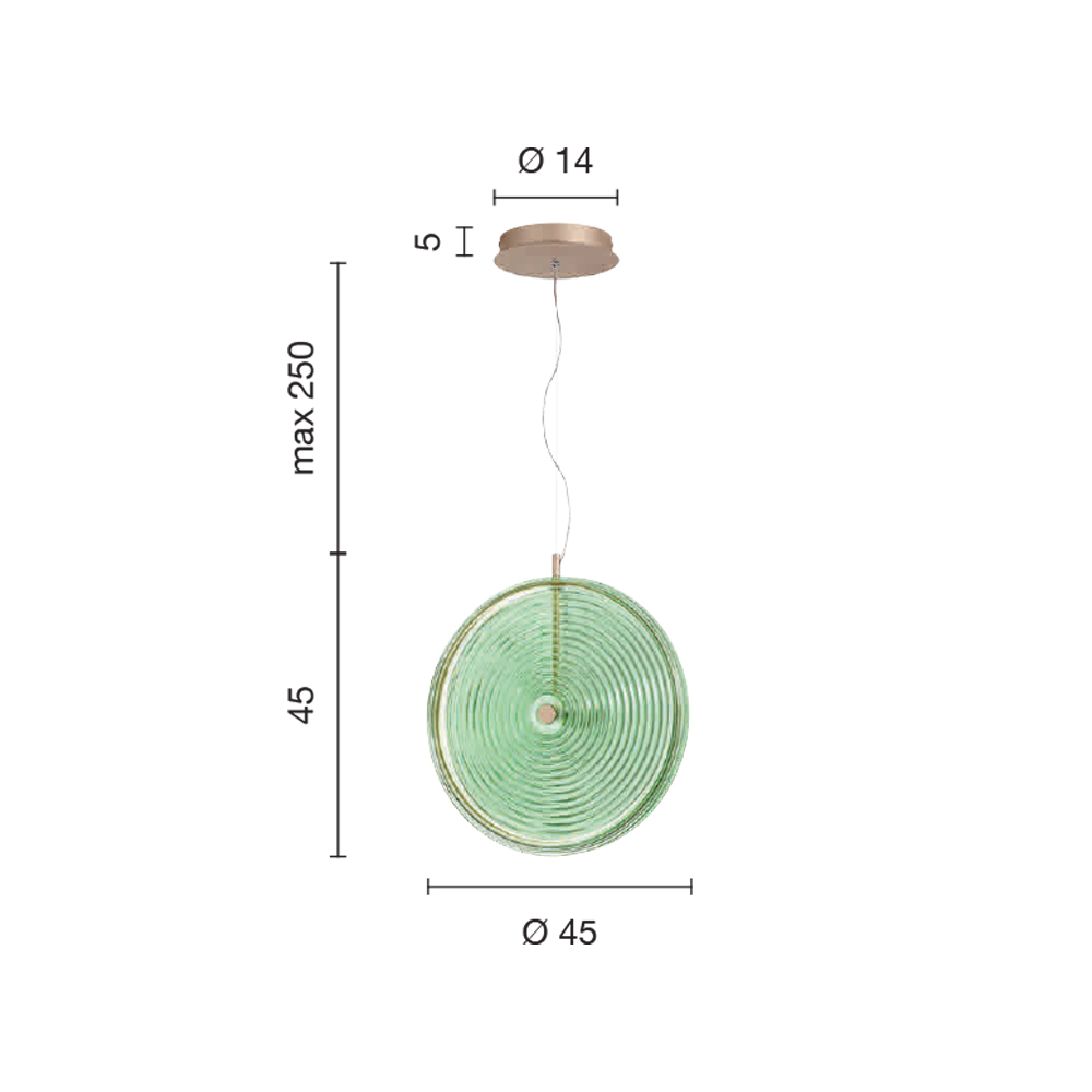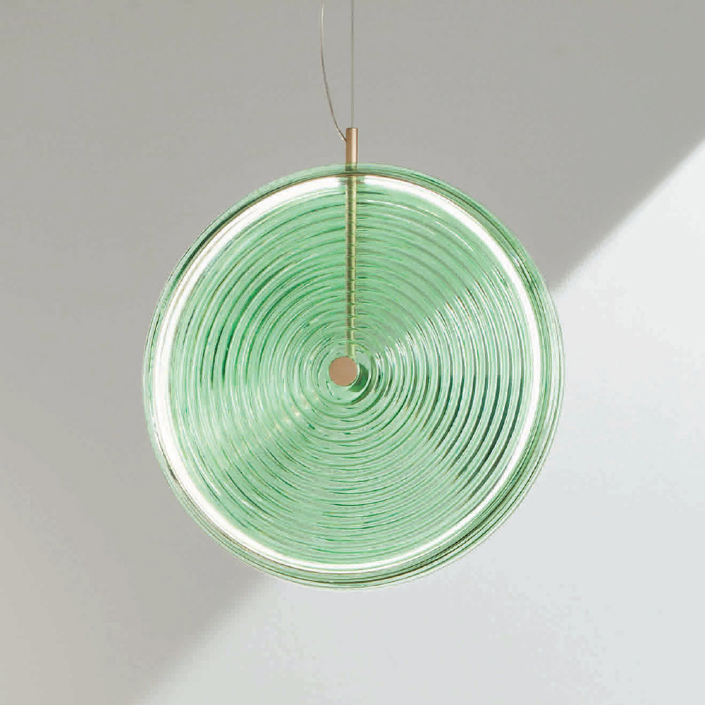 Komplett in Italien hergestellteHängeleuchte aus goldfarben lackiertem Metall,mit konzentrischen Linien verziertes Glas mit LED-Licht und längenverstellbarem Kabel . Ziel dieses Produkts ist es, die Tradition durch einen zeitgenössischen Ansatz aufzuwerten, bei dem Stil, Klasse und Innovation zu neuen Designformeln verschmelzen, um jede Umgebung mit Geschmack und Charakter einzurichten und zu beleuchten. Stärken sind die Besonderheit der Formen , die Qualität der Materialien und die Einzigartigkeit der Lichtquelle .