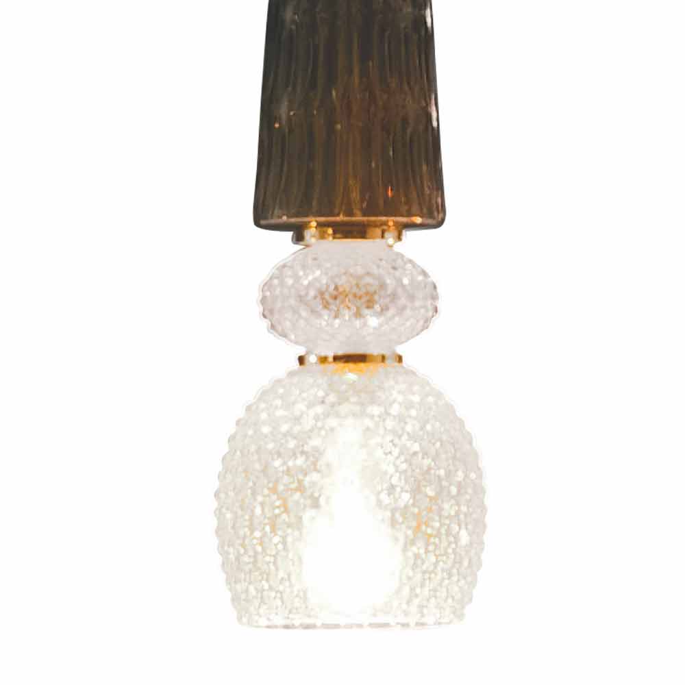Elegante Pendelleuchte made in Italy aus Muranoglas mit antikem Dekor, goldenen Details und anthrazitfarbenem Stoffkabel . Aus der perfekten Verschmelzung von Moderne und Tradition entsteht diese wunderbare Einrichtungsidee, die in der Lage ist, eine herrliche warme und einladende Atmosphäre zu schaffen und gleichzeitig die Ästhetik des Raumes dank der zeitlosen Eleganzdes hochwertigen Materials Muranoglas zu bereichern. und mit einer besonders raffinierten Persönlichkeit . Das Spiel geometrischer Formen und verschiedener Farben erzeugt einen dynamischen Effekt , der das Aussehen der Leuchte vervollständigt und ihren Wert und Wert unterstreicht.