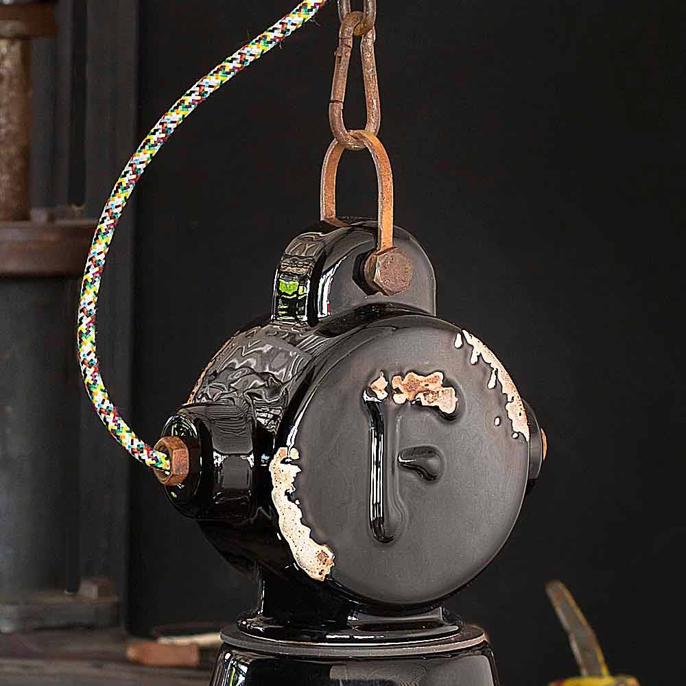Vintage Glockenleuchter aus Keramik und Metall Angela Ferroluce Angela ist eine fantastische Aufhängung in Glockenform und Vintage-Industriestil, handgefertigt von erfahrenen Handwerkern in Italien. Diese schöne Leuchte besteht aus einer Eisenstruktur mit einem Diffusor aus glänzender Keramik, erhältlich in verschiedenen Farben. Die Besonderheit dieser Leuchte liegt in der handwerklichen Verarbeitung des Keramikdiffusors. Die Keramik ist in der Tat so dekoriert, als ob die Zeit ihren Weg gezeichnet hätte. Die Reproduktion der Erosion der Zeit in Kombination mit den glänzenden Oberflächen verleihen dieser Aufhängung diesen zusätzlichen Wert. Dieser abgenutzte Effekt verleiht Angela einen raffinierten Vintage-Industrial-Stil. Die Metallstruktur verstärkt den antiken Effekt noch mehr. Leuchtende Farben, glänzende Oberflächen und raffinierte Alterungsspuren für ein aktuelles Profil im Gewand eines vergangenen Stils. Ideal für die Dekoration eines Landhauses im englischen Stil. Diese Aufhängung, die für Umgebungen mit einer einhüllenden Atmosphäre geschaffen wurde, kann dank eines einzigartigen und originellen Designs die anspruchsvollsten Anforderungen erfüllen. Ein Design, das sich dem Luxus widersetzt, aber harmonisch mit ihm koexistiert. Design, das die Wesentlichkeit des Gebrauchs bewahrt und mit einer feinen Balance zwischen Formen und Tönen beruhigt. Angela erweckt ein reines Licht ohne Abschirmung zum Leben. Es sind diese einfachen und zarten Formen, die Aufmerksamkeit erregen und die Angela in die Lage versetzen, sich an jedes Dekor anzupassen, von den einfachsten und minimalistischsten bis zu den klassischsten, wodurch ein zarter Kontrast entsteht. Bringen auch Sie einen Hauch von Design in Ihr Zuhause! Kleine Details für große Wirkung mit antikem Flair! Lampe in verschiedenen Ausführungen erhältlich. Überprüfen Sie die Farbkarte und geben Sie den Code der gewünschten Ausführung in das entsprechende Feld ein!