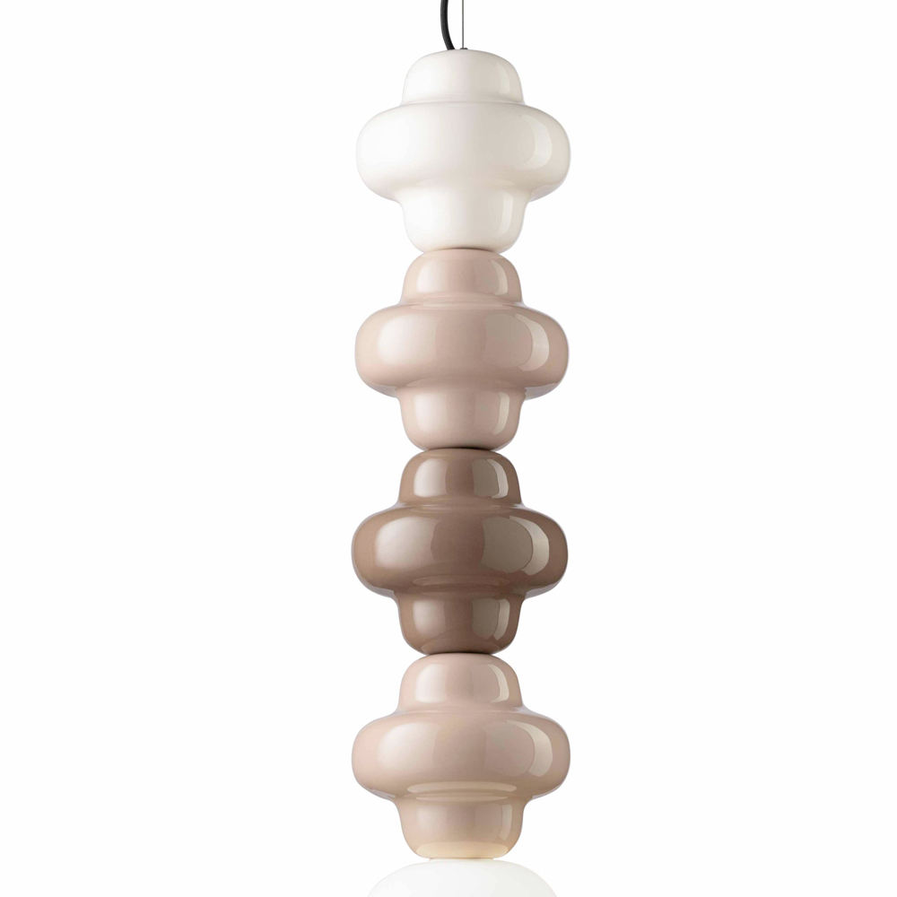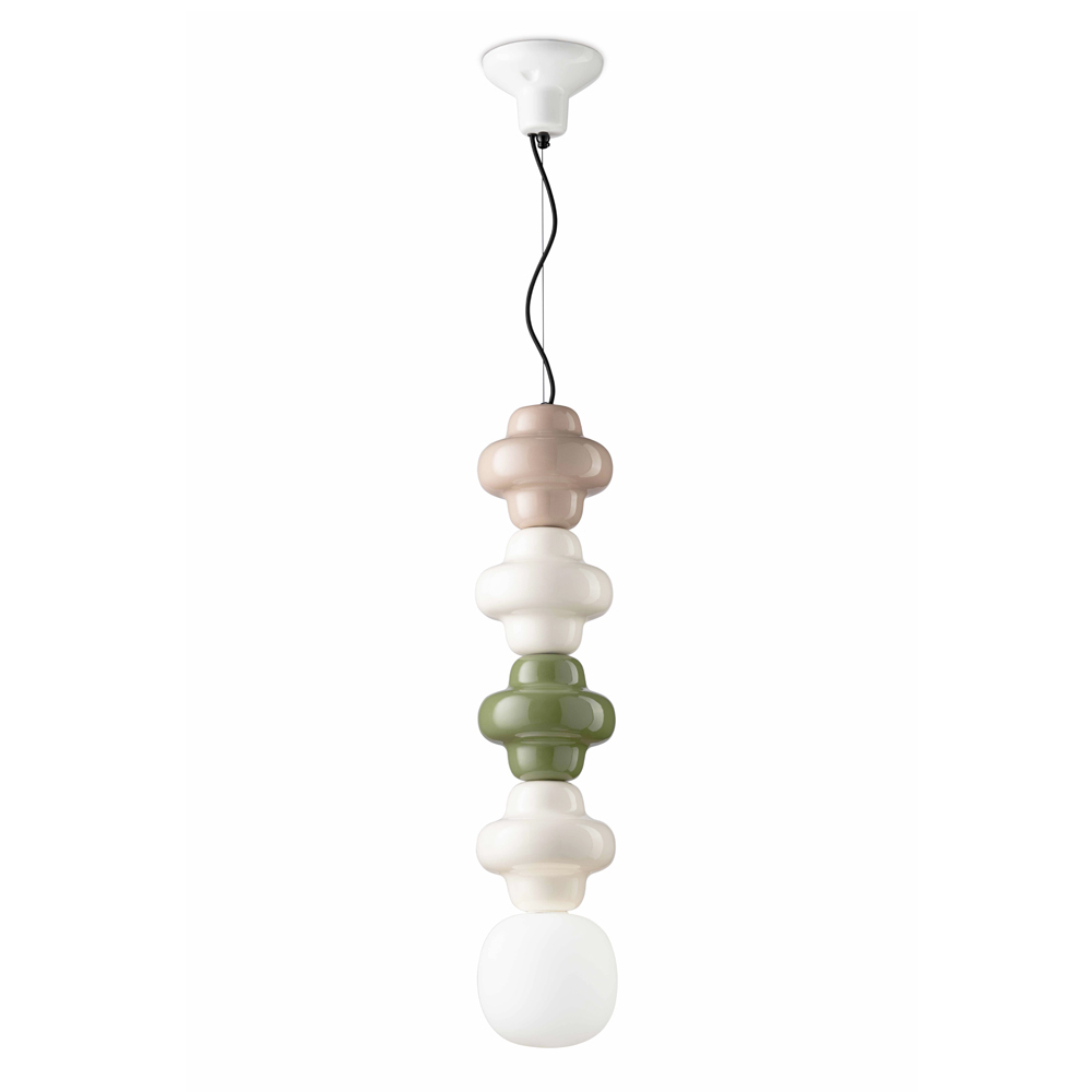 Hängeleuchte aus 4 farbigen Keramikelementen , Diffusor aus satiniertem Opalglas und ummanteltem Baumwollkabel, vollständig in Italien hergestellt.