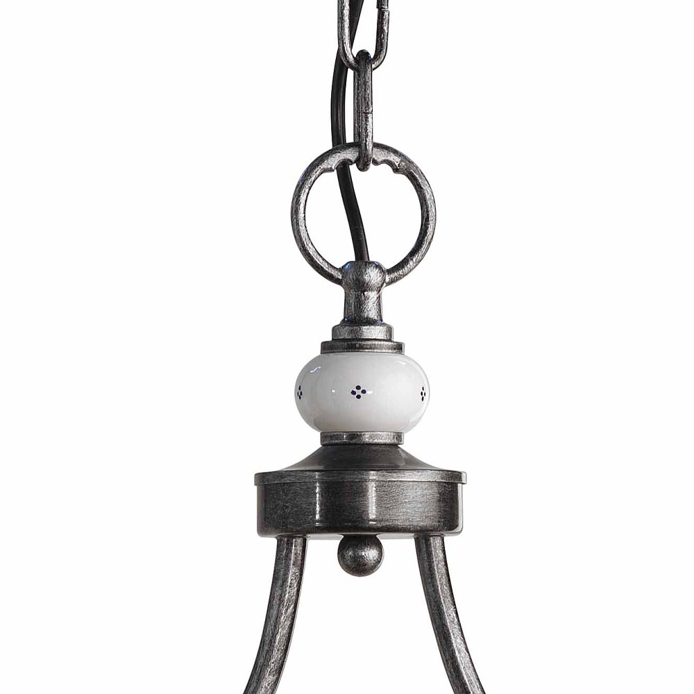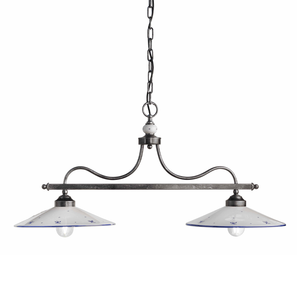 Die 2-flammige Pendelleuchte besteht vollständig aus Eisen und Keramik mit handbemalten blauen Fadenverzierungen die das Geschick und die handwerklichen Fähigkeiten der Handwerker hervorheben.