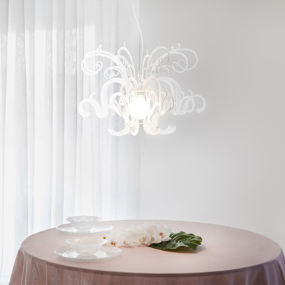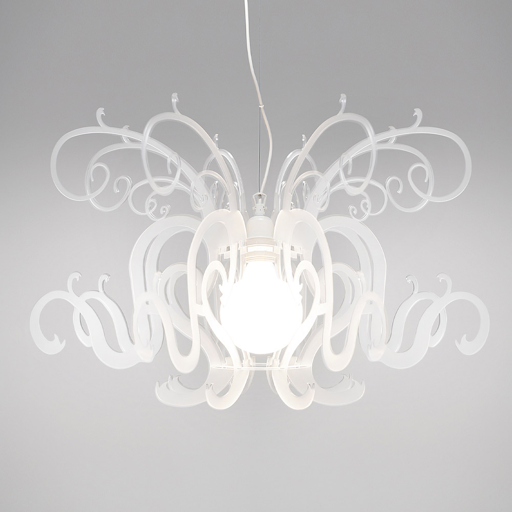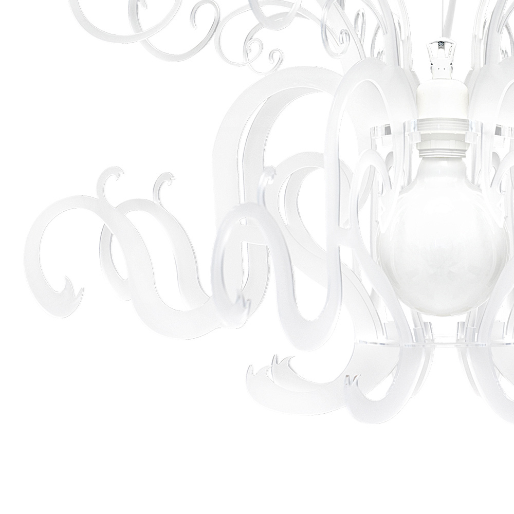 Der prächtige und hocheffektive Hängeleuchter wird fachmännisch durch Linien und Formen geschaffen, die die außergewöhnlichen optischen Eigenschaften der Lichtdurchlässigkeit des reinen PMMA, mit dem er vollständig hergestellt wurde, verstärken. Konzipiert, entworfen und hergestellt in Italien , mit italienischen Materialien, die Helligkeit und Brillanz konstant und im Laufe der Zeit unverändert.