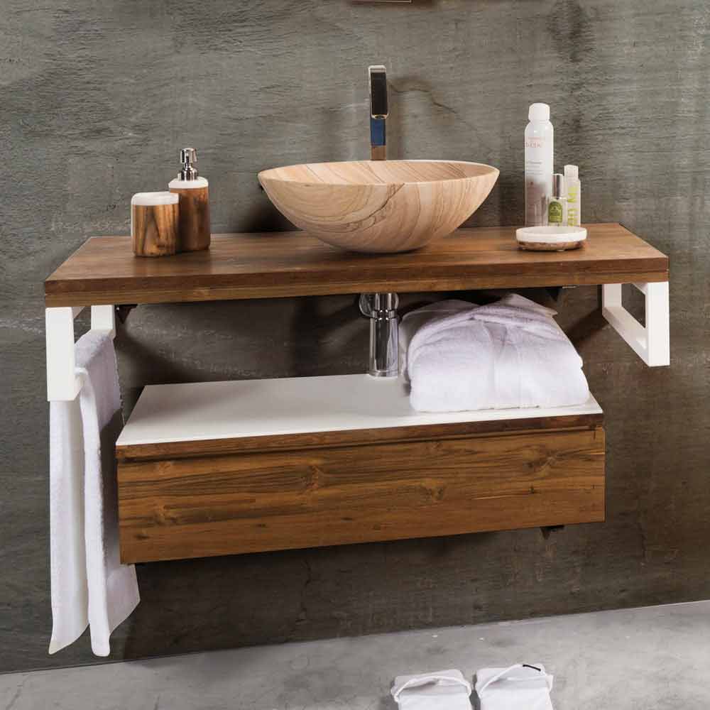 Hängender Badezimmer-Konsolenschrank aus Teakholz und Hi Macs mit Schublade.