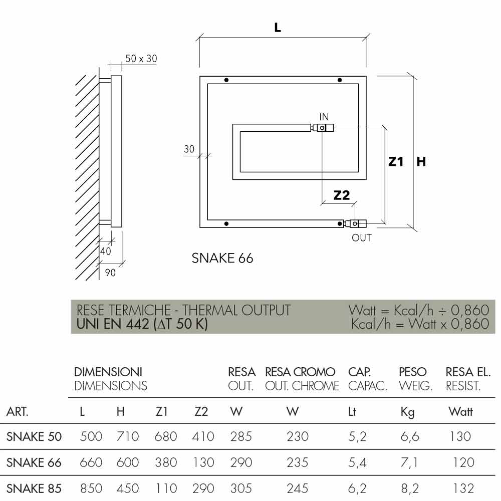 Maße L.660 mm, H.600 mm, Achsabstand1 380 mm, Achsabstand2 130 mm, Wärmeausbeute 290 Watt, Kapazität 5,4 Lt, Gewicht 7,1 kg