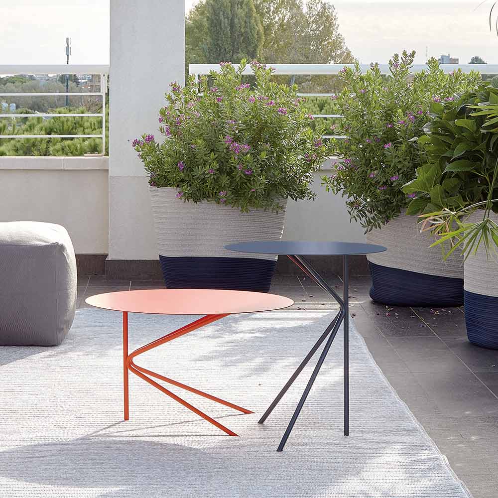 Dieser Gartentisch hat ein minimalistisches Design mit einer runden Platte, die in zwei verschiedenen Größen und zwei verschiedenen Höhen erhältlich ist und zu einem modernen und eleganten Wohnzimmer kombiniert werden kann.