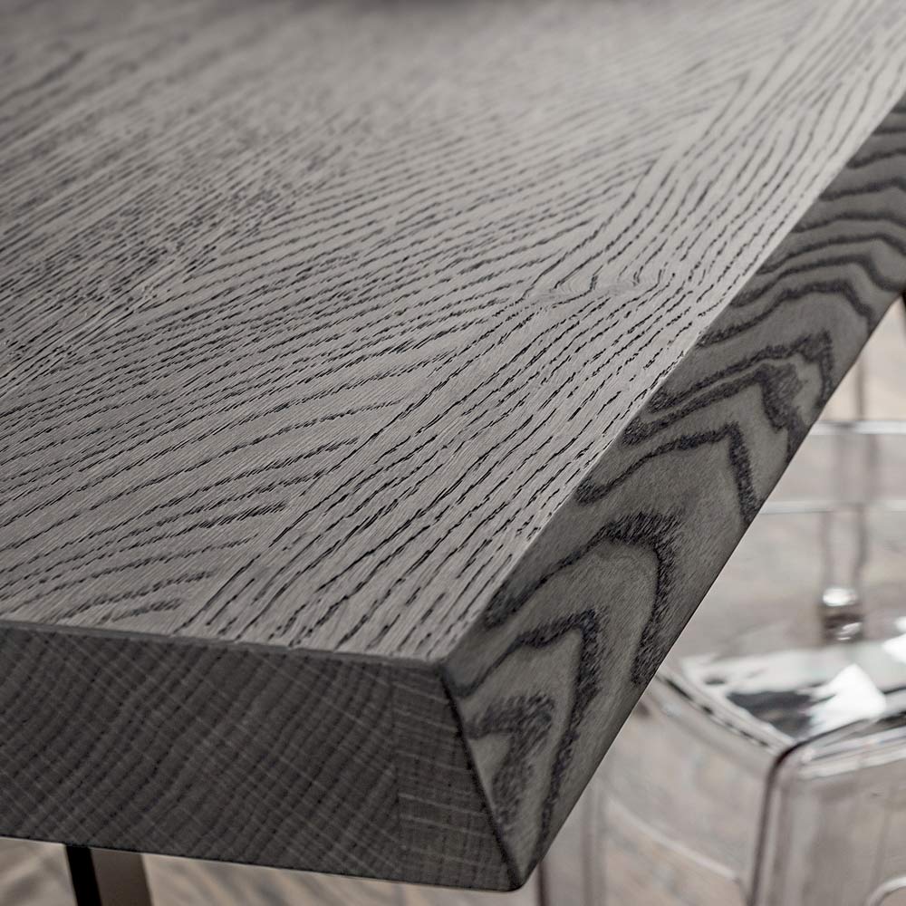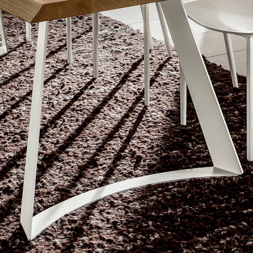 In Italien hergestellter Esstisch mit Platte aus entrindetem Holz, die aus einer 50 mm dicken furnierten Platte mit Seiten aus Massivholz und mit Epoxidpulvern in Weiß lackierten Metallbeinen erhalten wird.