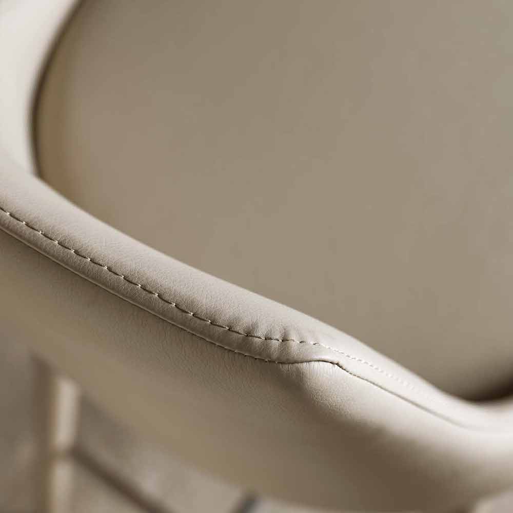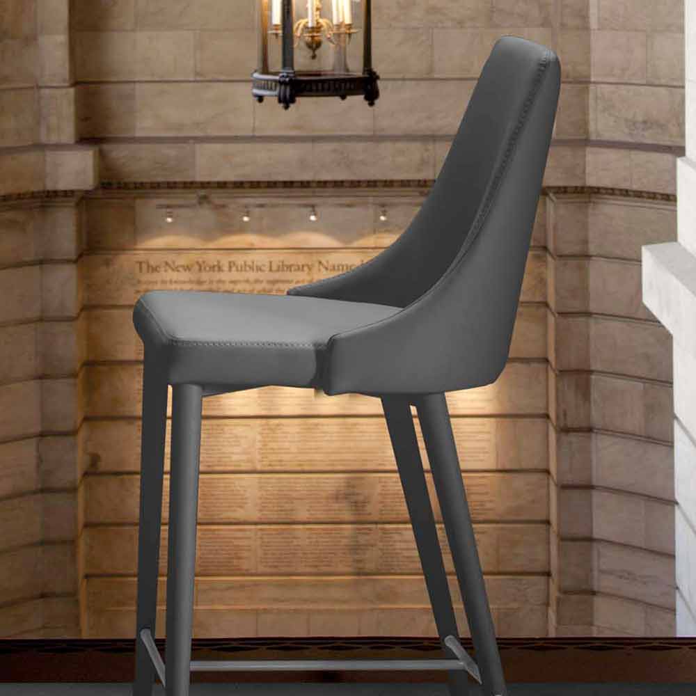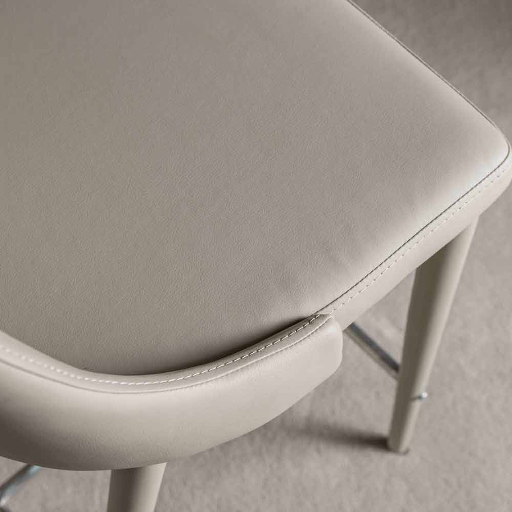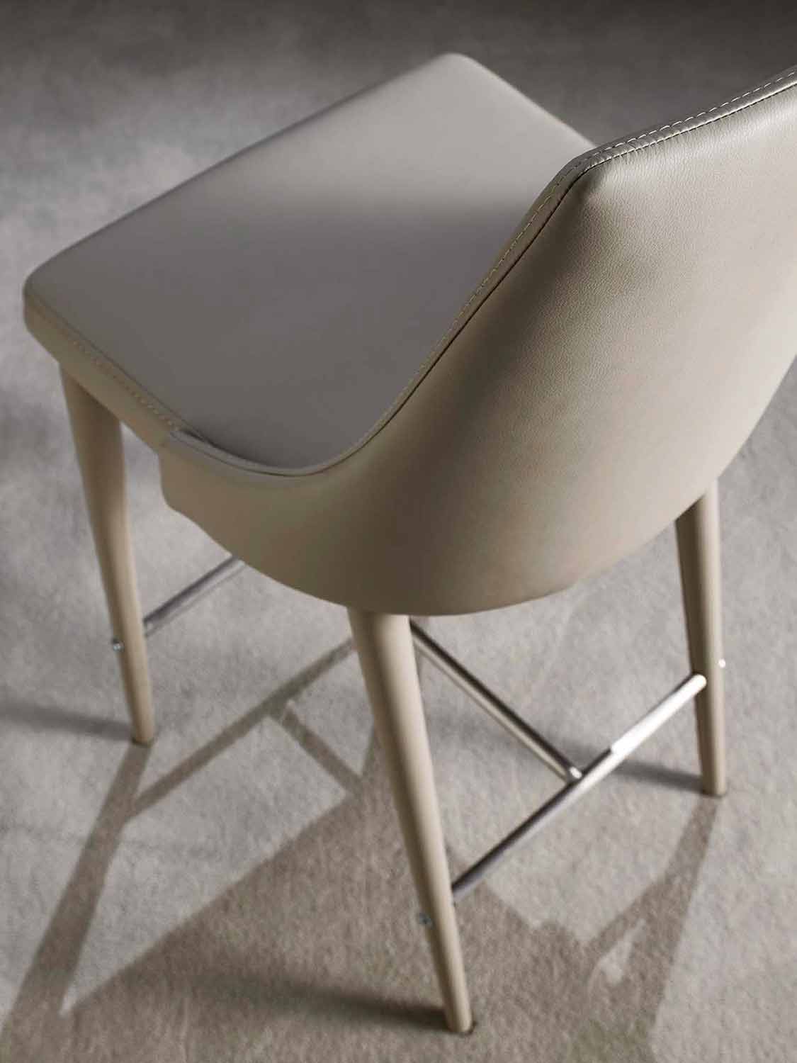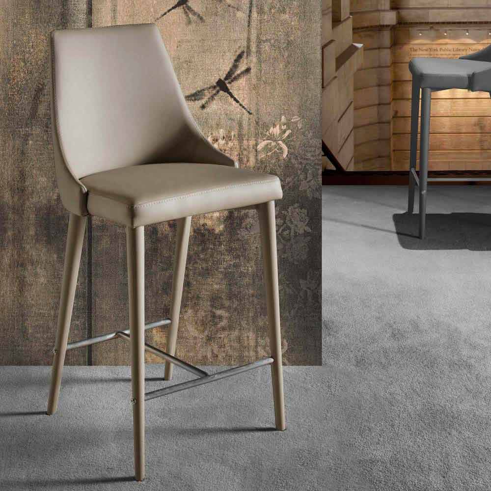 Außerdem ist er mit einer praktischen Fußstütze aus Naturstahl ausgestattet. Die Struktur besteht aus lackiertem Metall in der gleichen Farbe von der Sitzfläche, die aus Kunstleder hergestellt ist.