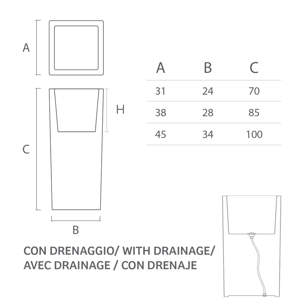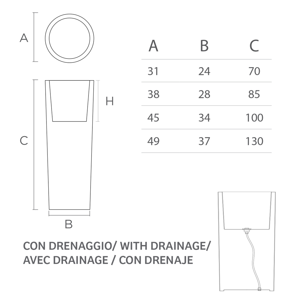 Die Struktur umfasst ein Wasserablaufset, mit dem diese Vase Innen- und Außenbereiche dekorieren kann, ohne den praktischen und funktionalen Aspekt zu beeinträchtigen. Schließlich ist diese Innenvase mit einem integrierten LED-Licht ausgestattet, um Innenräumen, aber auch Außenbereichen bei Veranstaltungen einen zusätzlichen Hauch von Stil zu verleihen.