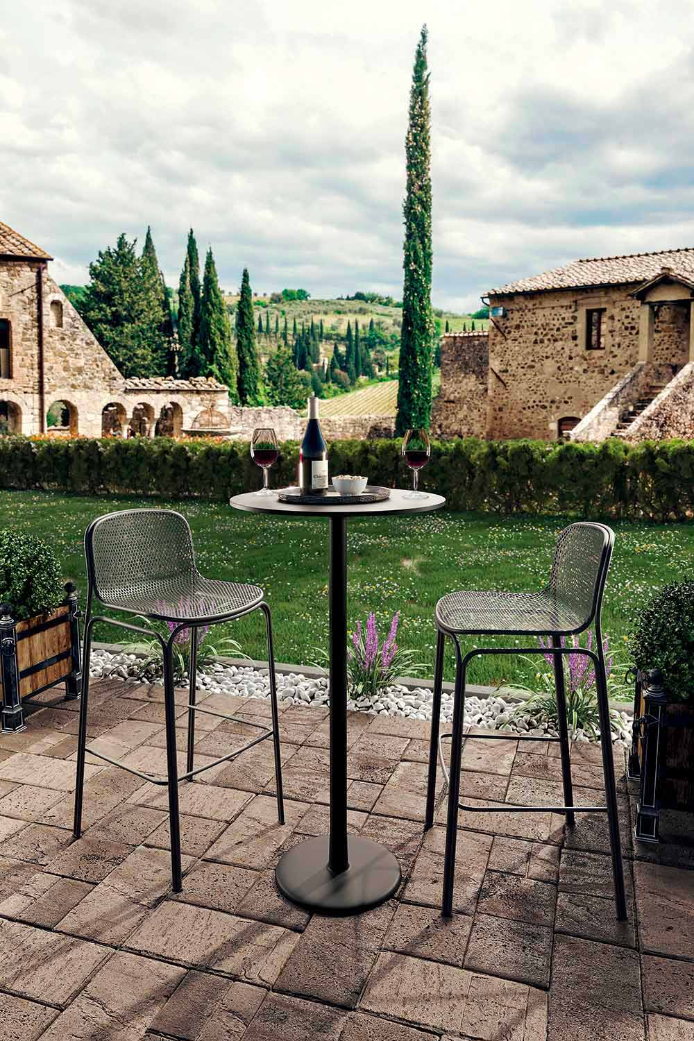 Viviette ist ein bequemer und moderner Außenhocker, der vollständig aus Metall und Drahtgeflecht besteht und es schafft, traditionelle Linien und sein zeitgemäßes Design perfekt zu kombinieren, wodurch der Hocker auch dank der vorhandenen Rückenlehne solide und bequem wird. Vviviette ist in 5 Farbvarianten erhältlich, die es ermöglichen, jeder Umgebung Persönlichkeit zu verleihen. Es ist ein stapelbarer Hocker mit maximal 6 Einheiten , mit dem Sie den Raum optimal optimieren können.