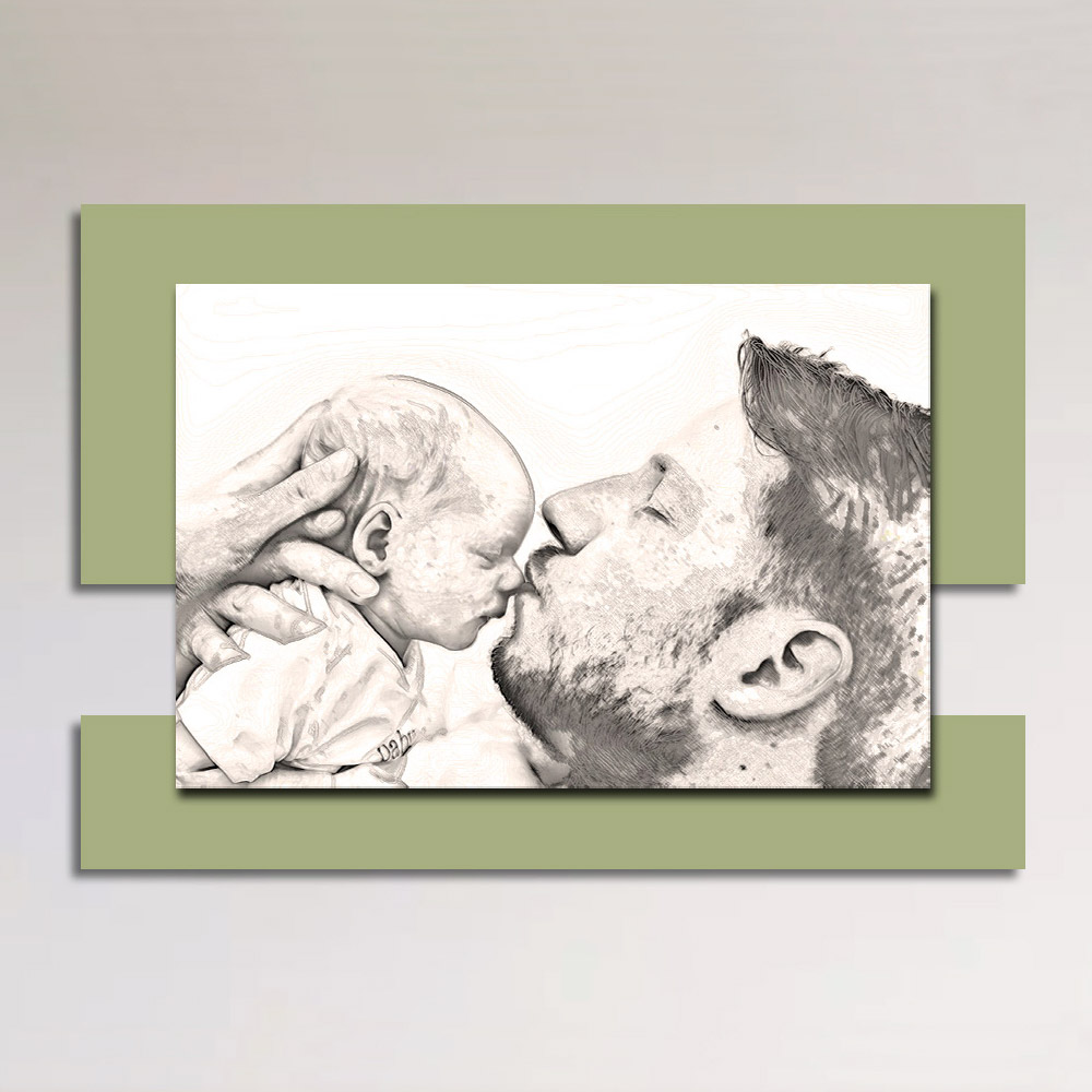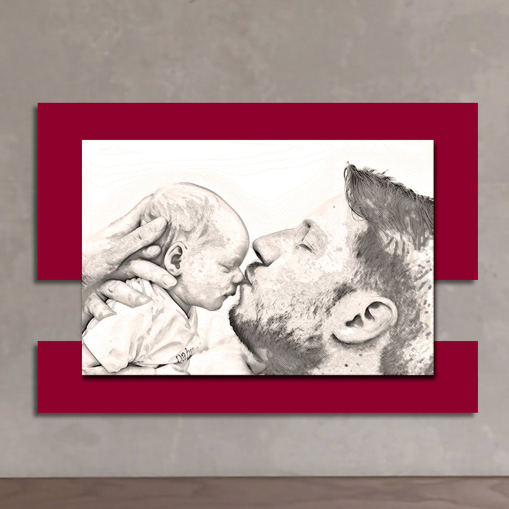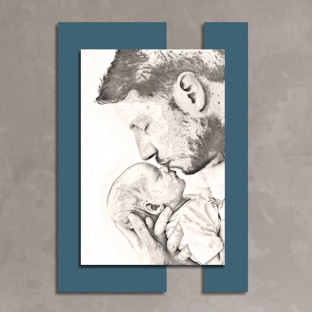 Holz mit dem Aufdruck eines Mannes, der ein Kind küsst. Buchsen zum