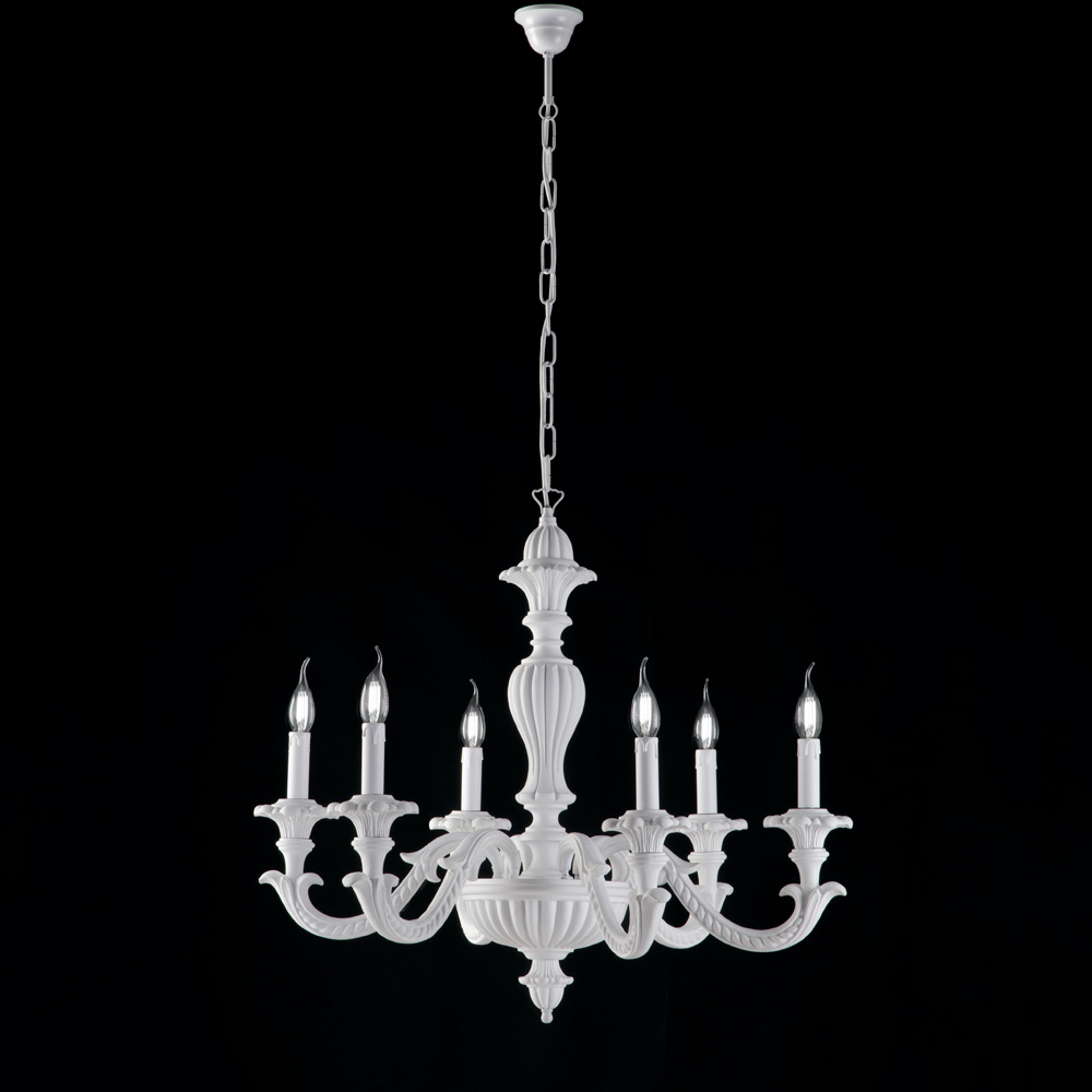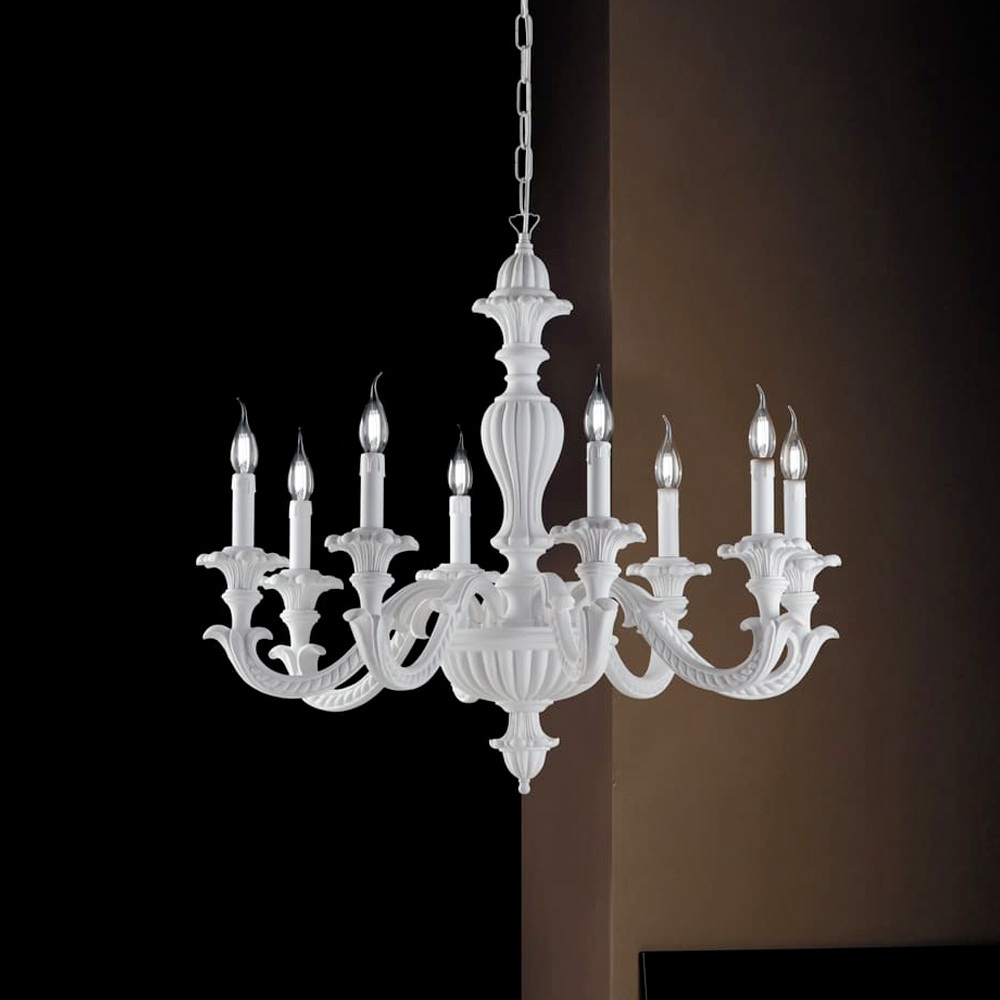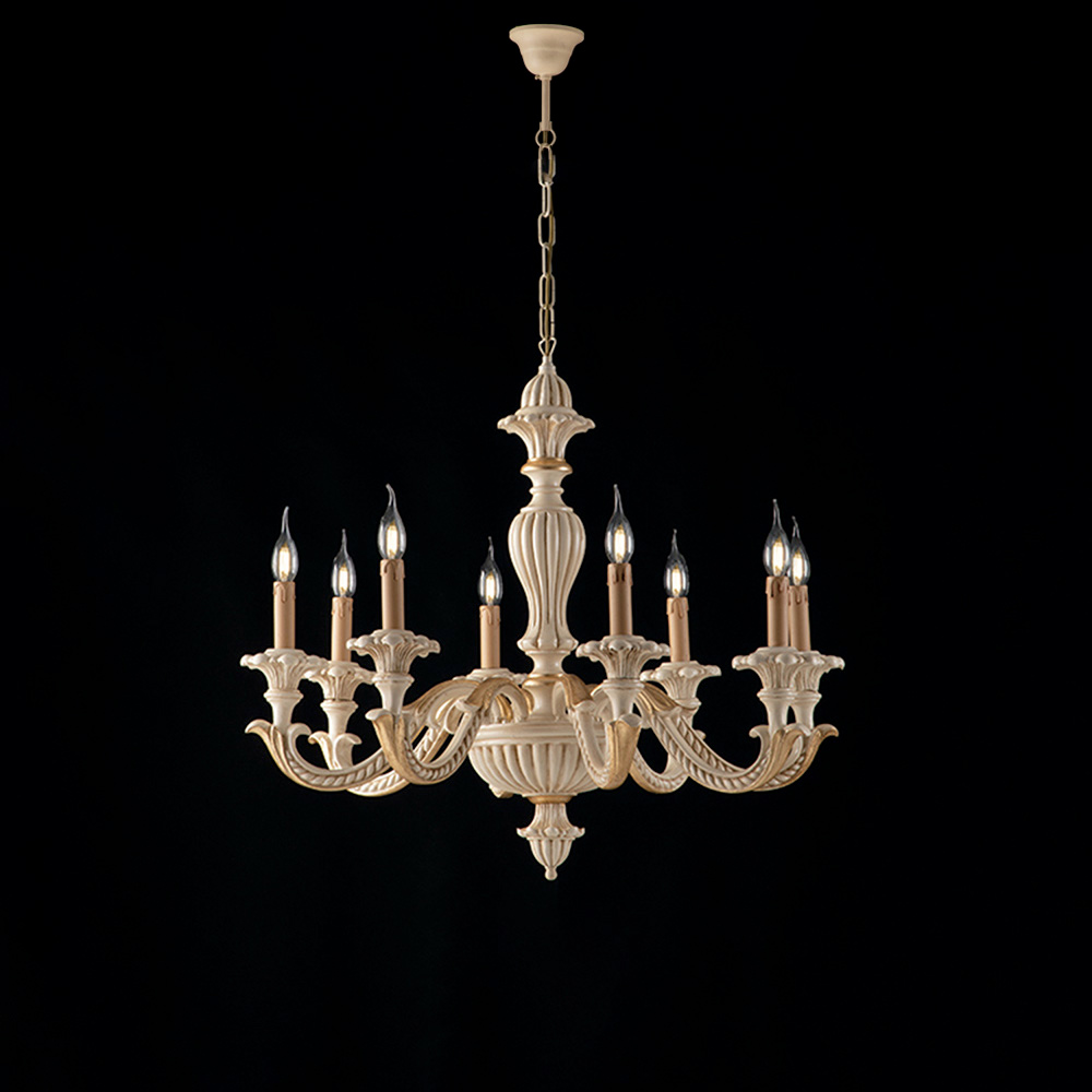 Erhältlich in der zarten Ausführung Shabby White mit romantischem und leuchtendem Charakter oder in der kostbaren Variante Elfenbein mit Blattgold , ideal für elegante und repräsentative Umgebungen, fügt sich dieser Kronleuchter harmonisch in Wohnzimmer, Esszimmer, repräsentative Eingangsbereiche, klassische Lounges und prestigeträchtige Objekträume ein.